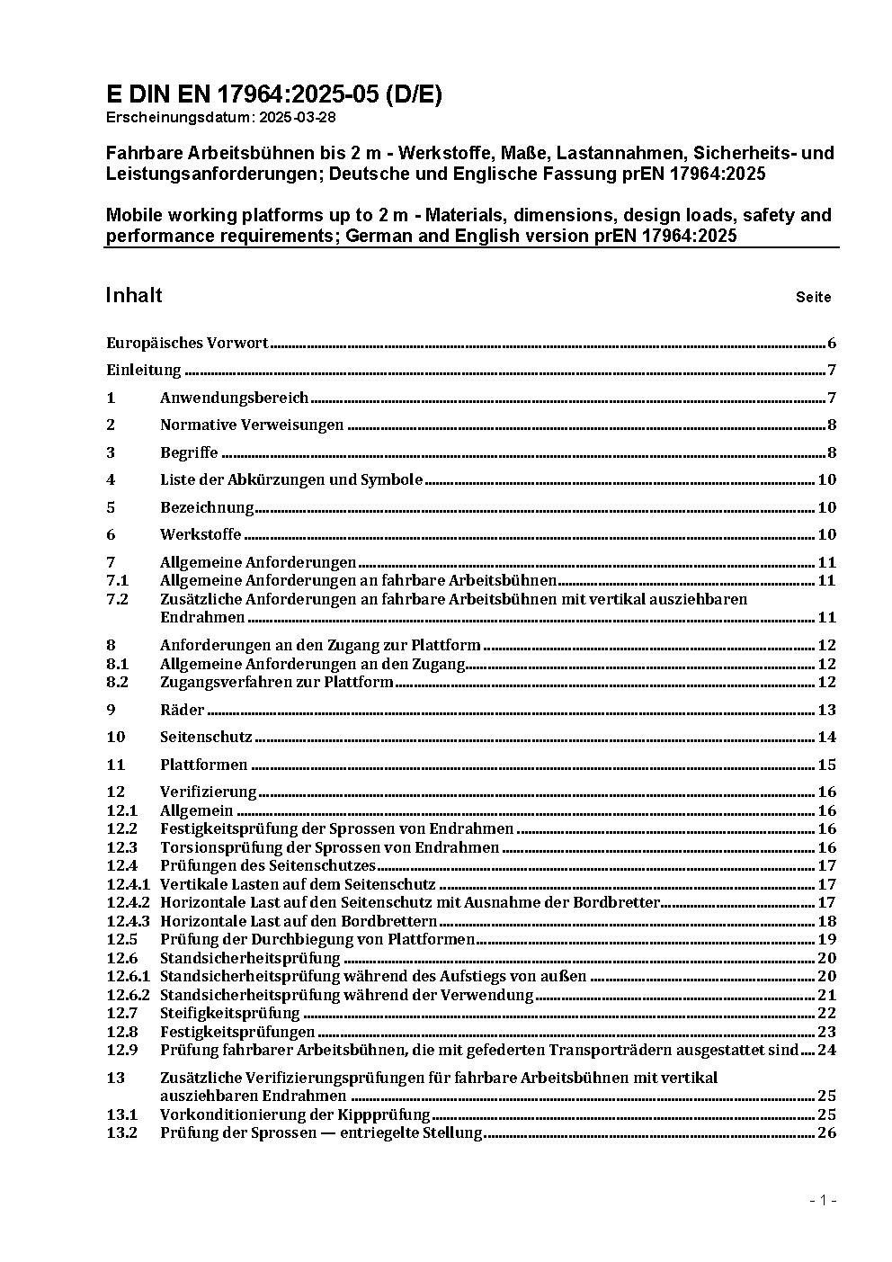 Fahrbare Arbeitsbühnen bis 2 m - Werkstoffe, Maße, Lastannahmen, Sicherheits- und Leistungsanforderungen; Deutsche und Englische Fassung prEN 17964:2025