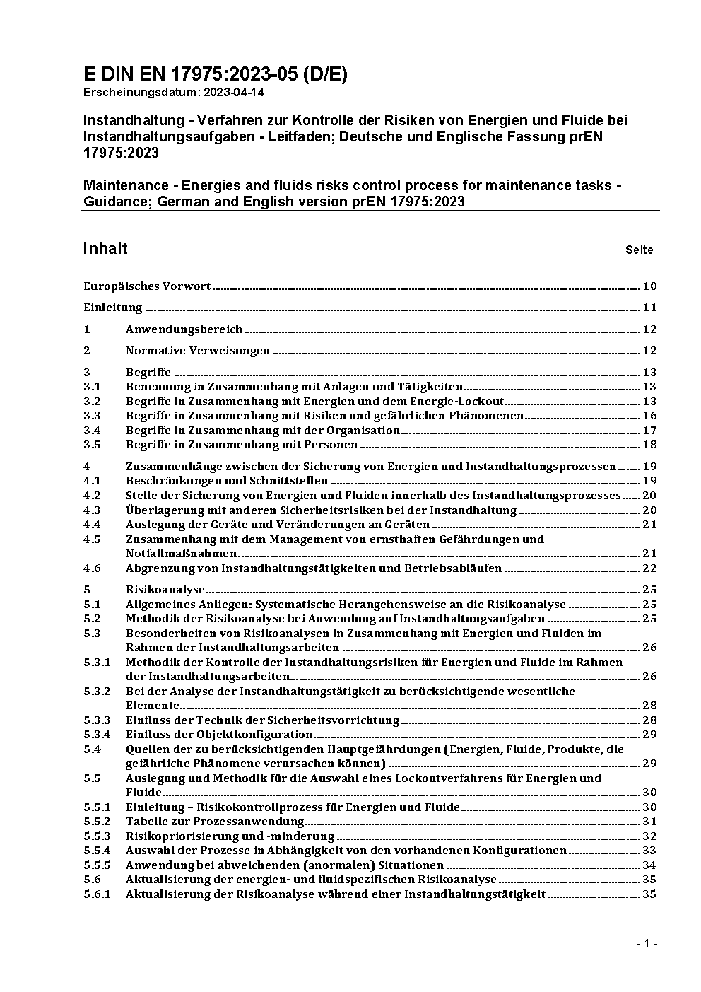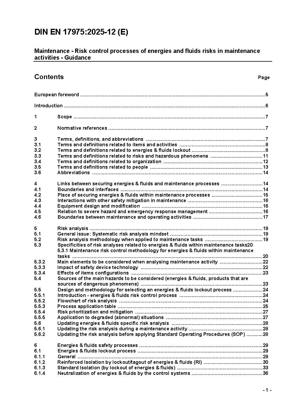 Instandhaltung - Verfahren zur Kontrolle der Risiken von Energien und Fluide bei Instandhaltungsmaßnahmen - Leitfaden; Deutsche Fassung EN 17975:2025