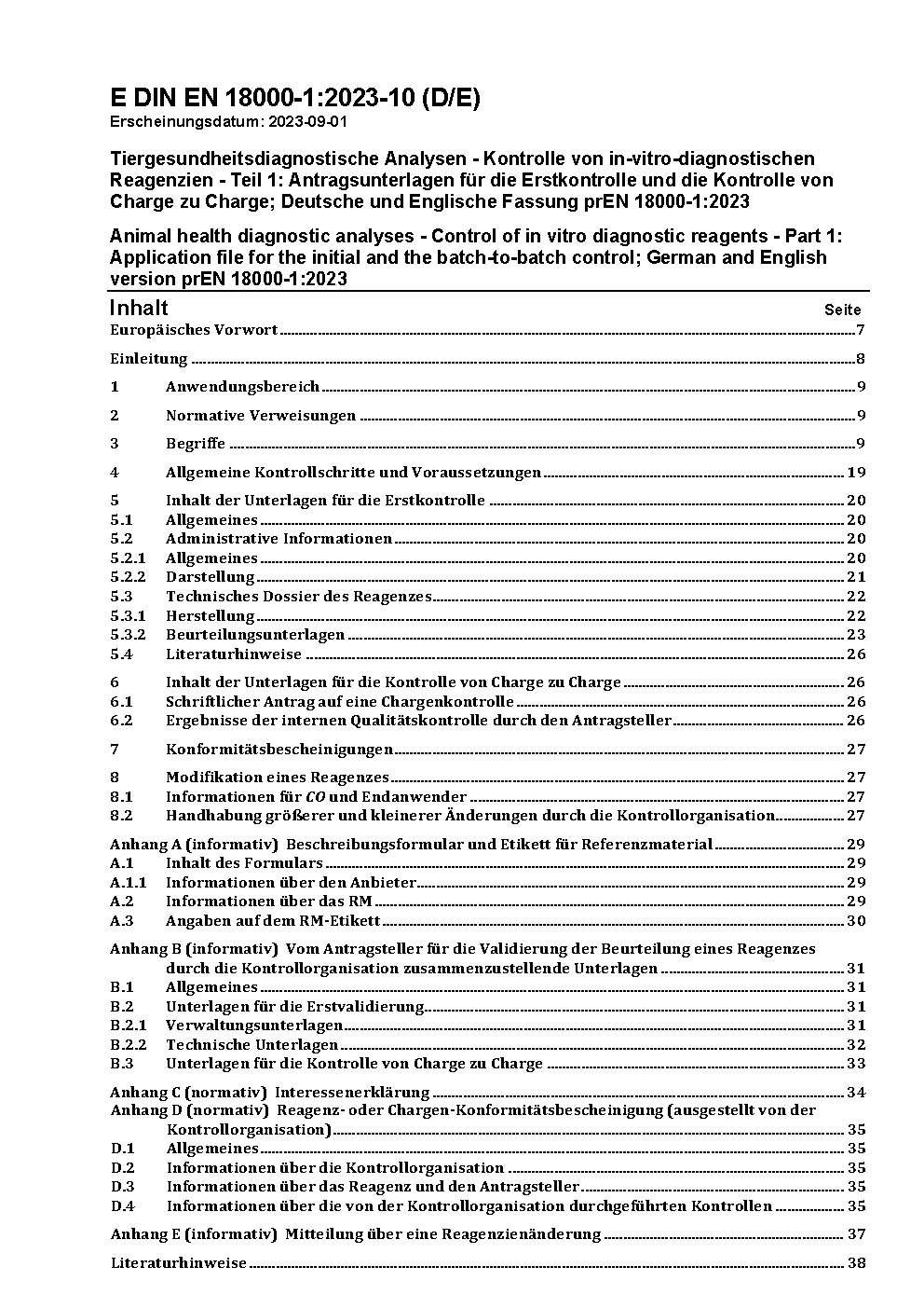 Tiergesundheitsdiagnostische Analysen - Kontrolle von in-vitro-diagnostischen Reagenzien - Teil 1: Antragsunterlagen für die Erstkontrolle und die Kontrolle von Charge zu Charge; Deutsche und Englische Fassung prEN 18000-1:2023