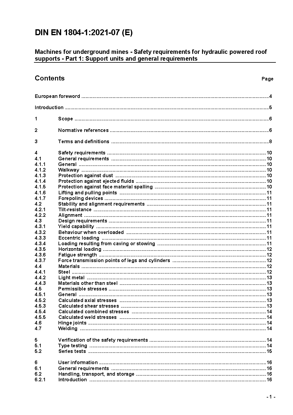 Machines for underground mines - Safety requirements for hydraulic powered roof supports - Part 1: Support units and general requirements; German and English version prEN 1804-1:2019