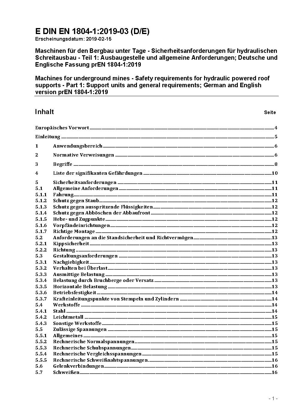 Maschinen für den Bergbau unter Tage - Sicherheitsanforderungen für hydraulischen Schreitausbau - Teil 1: Ausbaugestelle und allgemeine Anforderungen; Deutsche und Englische Fassung prEN 1804-1:2019