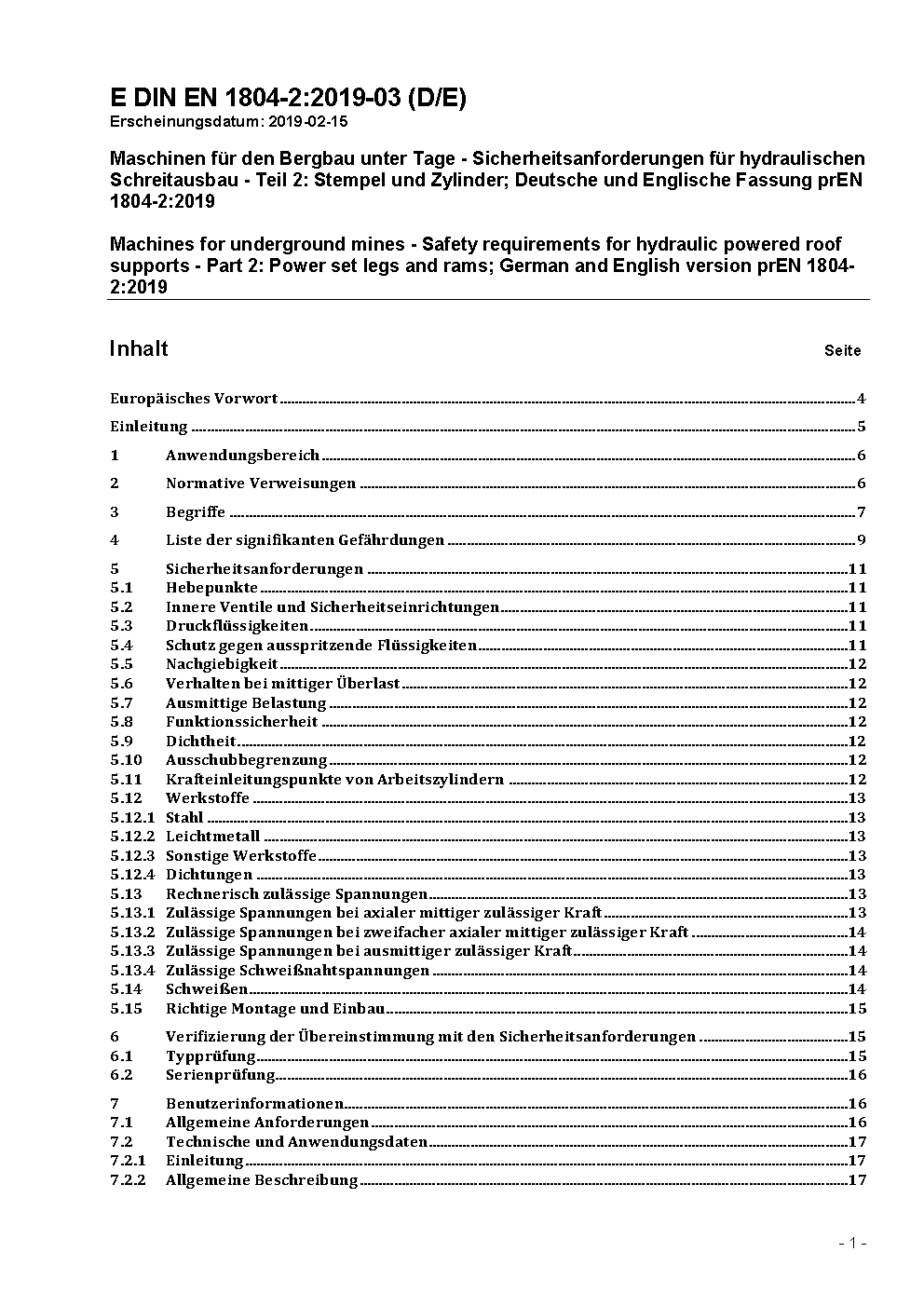 Maschinen für den Bergbau unter Tage - Sicherheitsanforderungen für hydraulischen Schreitausbau - Teil 2: Stempel und Zylinder; Deutsche Fassung EN 1804-2:2020