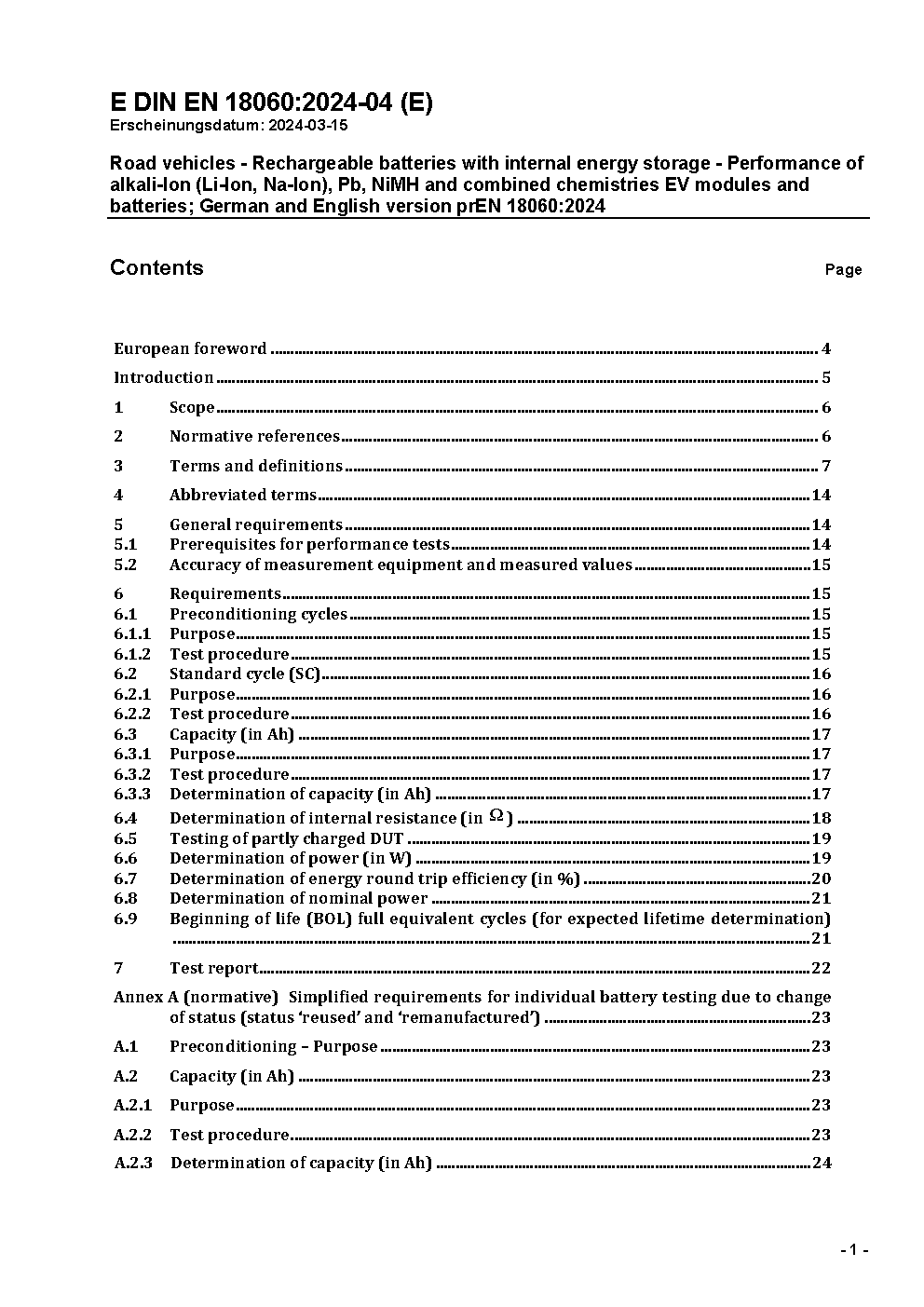 Road vehicles - Rechargeable batteries with internal energy storage - Performance of alkali-Ion (Li-Ion, Na-Ion), Pb, NiMH and combined chemistries EV modules and batteries; German and English version prEN 18060:2024