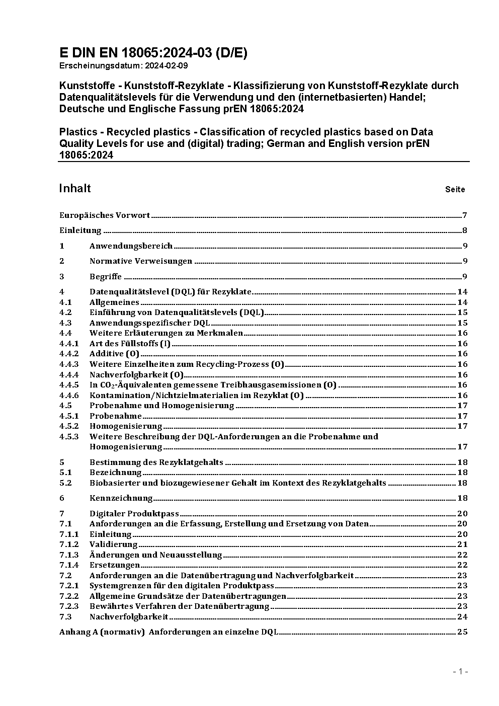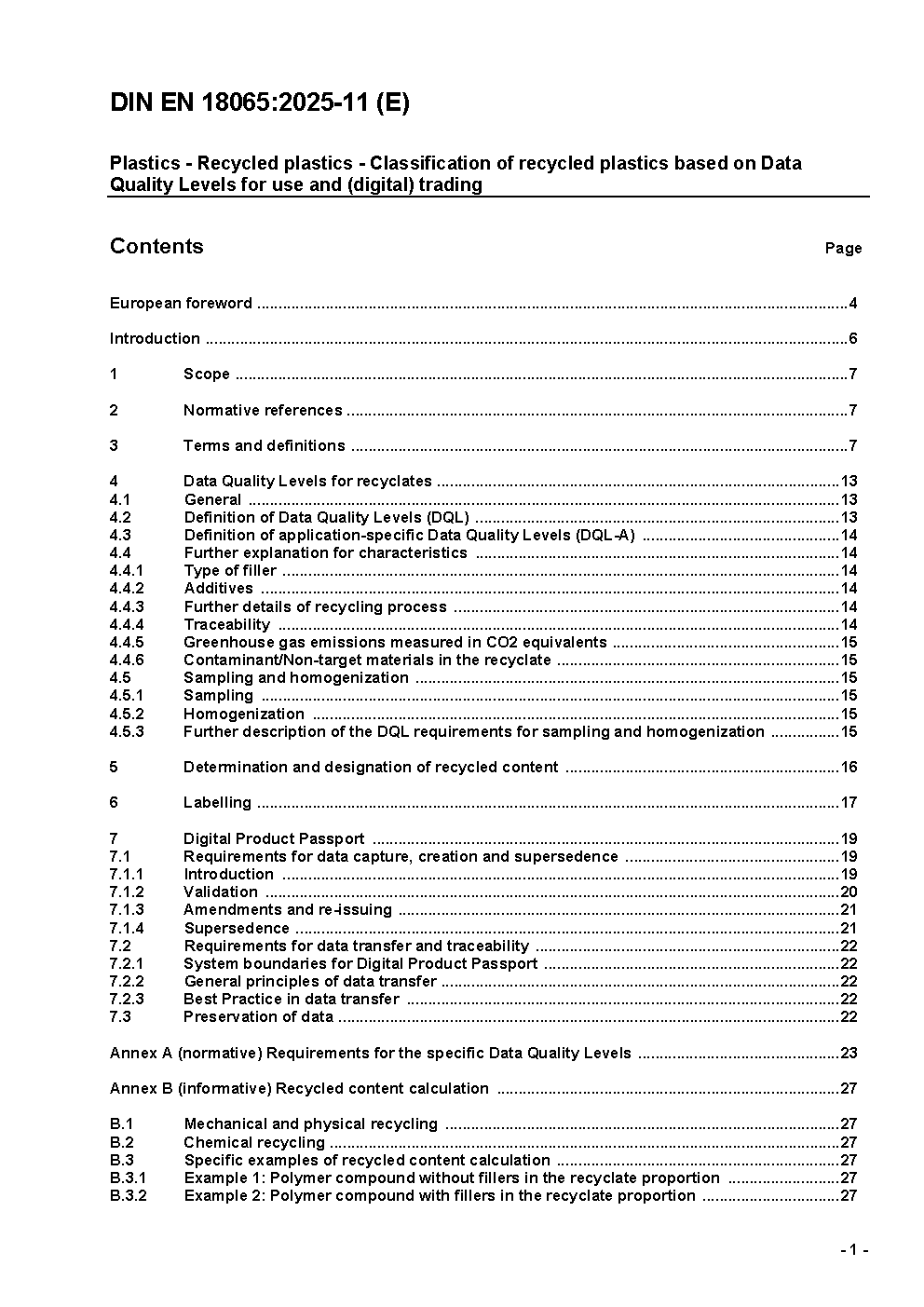 Plastics - Recycled plastics - Classification of recycled plastics based on Data Quality Levels for use and (digital) trading; German and English version prEN 18065:2024