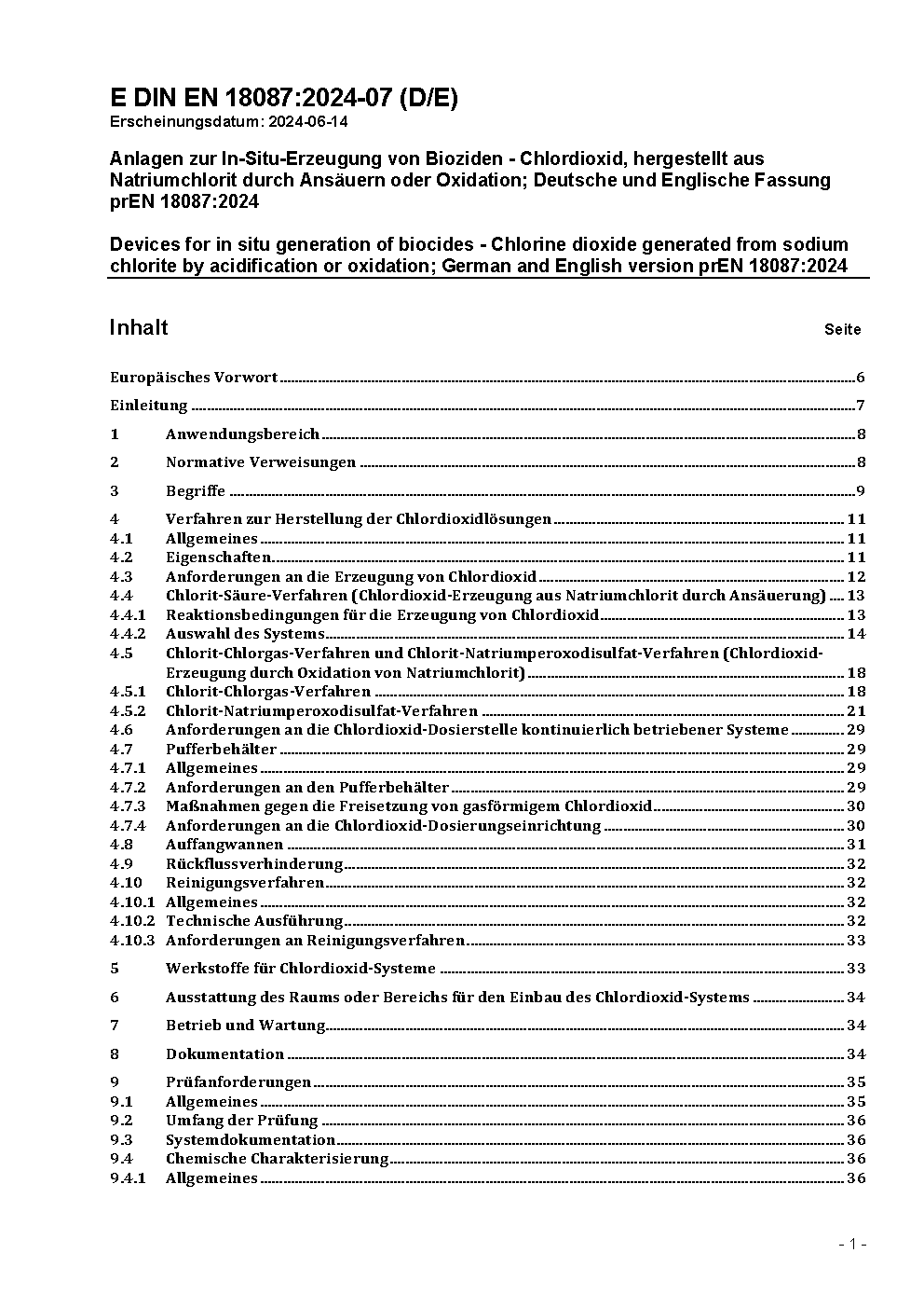 Anlagen zur In-Situ-Erzeugung von Bioziden - Chlordioxid, hergestellt aus Natriumchlorit durch Ansäuern oder Oxidation; Deutsche Fassung EN 18087:2026 / Achtung: Diese Norm ist Bestandteil des DVGW Regelwerks.