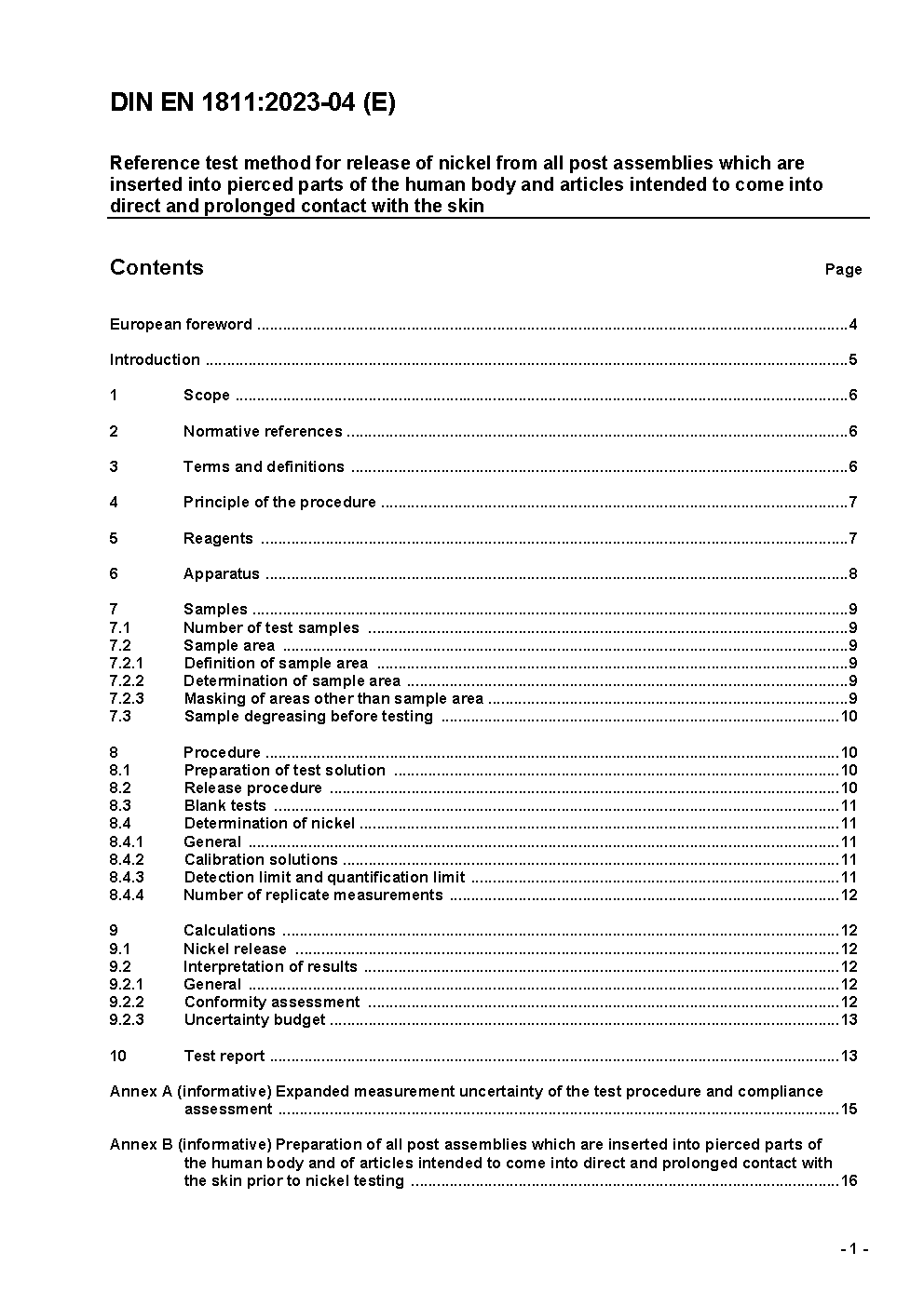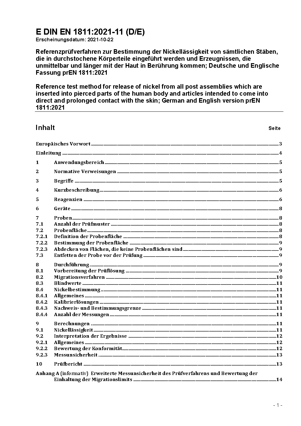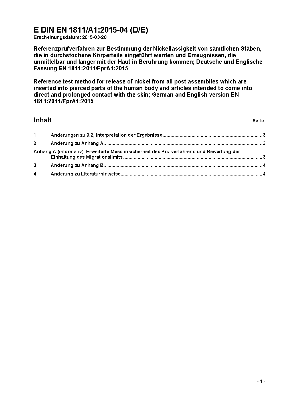 Reference test method for release of nickel from all post assemblies which are inserted into pierced parts of the human body and articles intended to come into direct and prolonged contact with the skin; German version EN 1811:2011+A1:2015