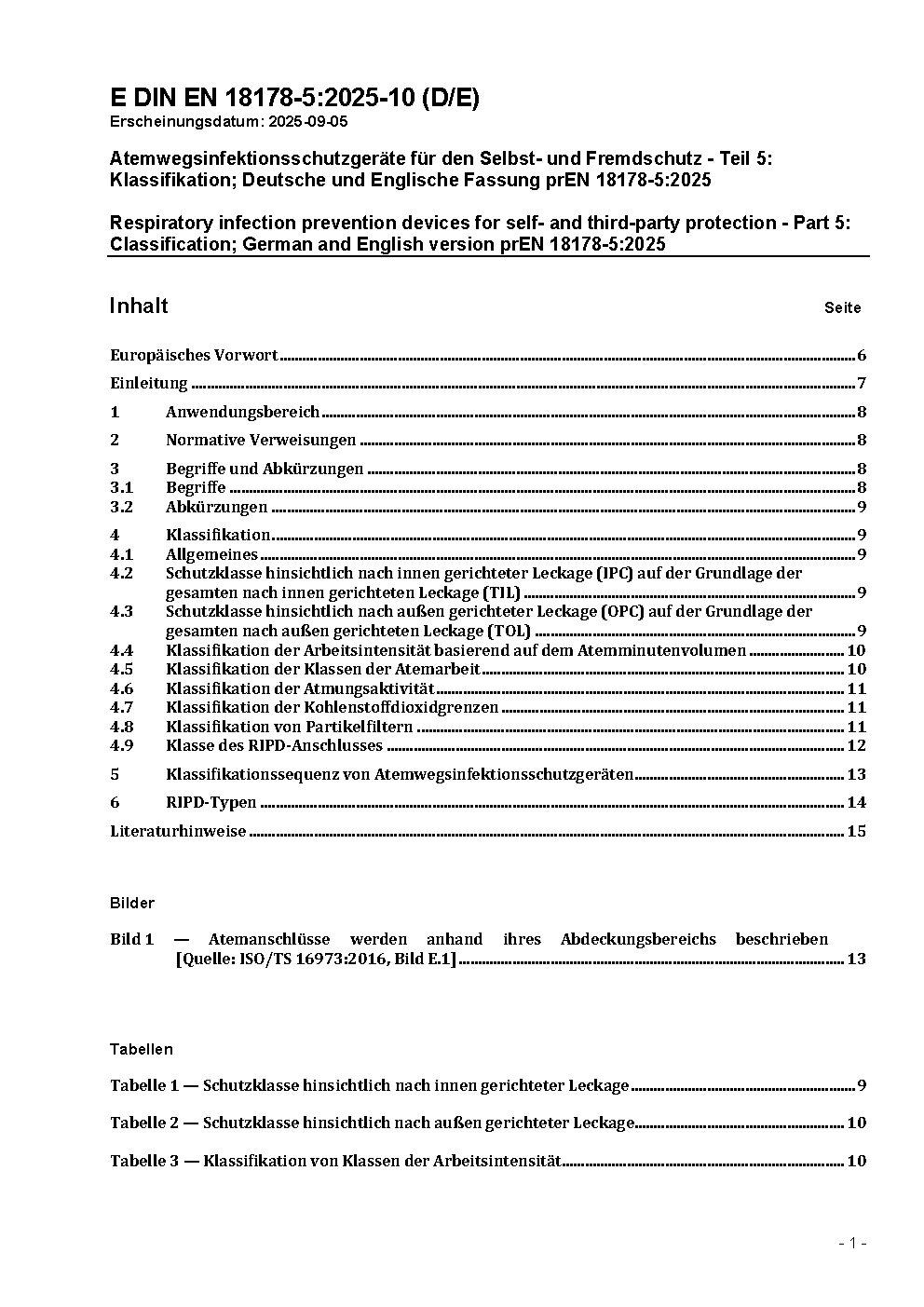 Atemwegsinfektionsschutzgeräte für den Selbst- und Fremdschutz - Teil 5: Klassifikation; Deutsche und Englische Fassung prEN 18178-5:2025