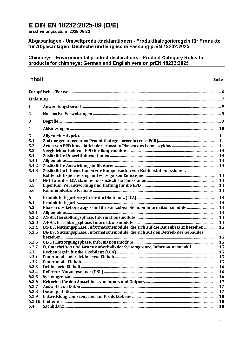 Abgasanlagen - Umweltproduktdeklarationen - Produktkategorieregeln für Produkte für Abgasanlagen; Deutsche und Englische Fassung prEN 18232:2025