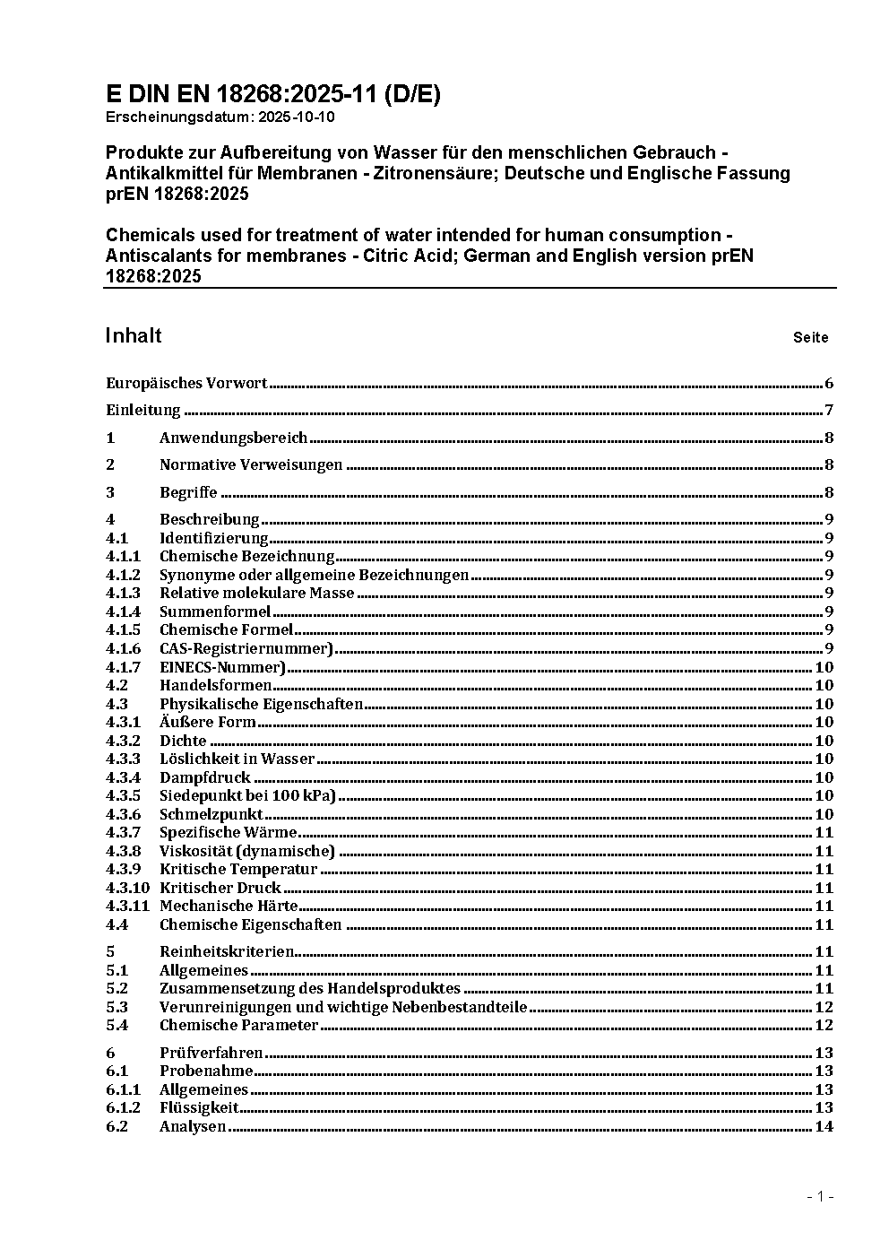 Produkte zur Aufbereitung von Wasser für den menschlichen Gebrauch - Antikalkmittel für Membranen - Zitronensäure; Deutsche und Englische Fassung prEN 18268:2025