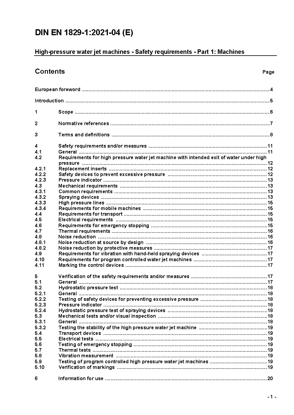 High-pressure water jet machines - Safety requirements - Part 1: Machines; German and English version prEN 1829-1:2018