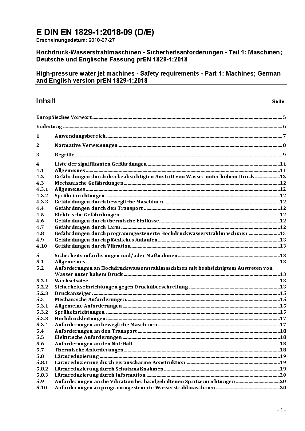 Hochdruck-Wasserstrahlmaschinen - Sicherheitsanforderungen - Teil 1: Maschinen; Deutsche und Englische Fassung prEN 1829-1:2018