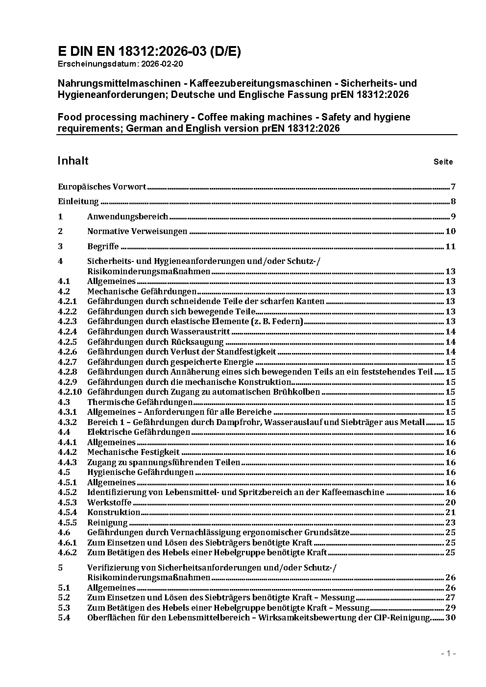Nahrungsmittelmaschinen - Kaffeezubereitungsmaschinen - Sicherheits- und Hygieneanforderungen; Deutsche und Englische Fassung prEN 18312:2026
