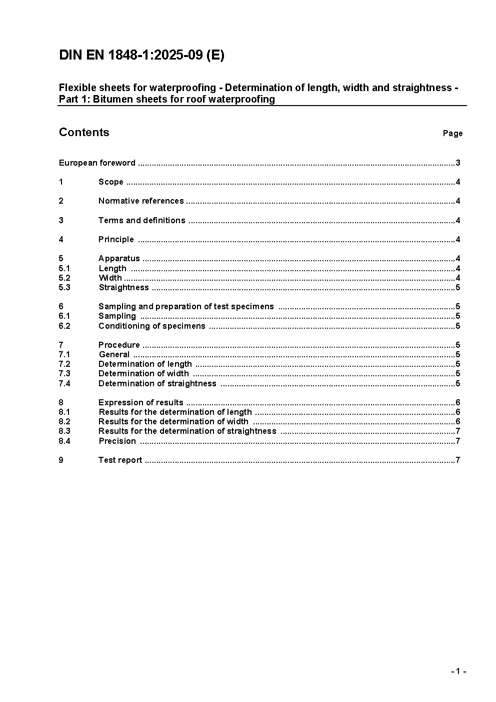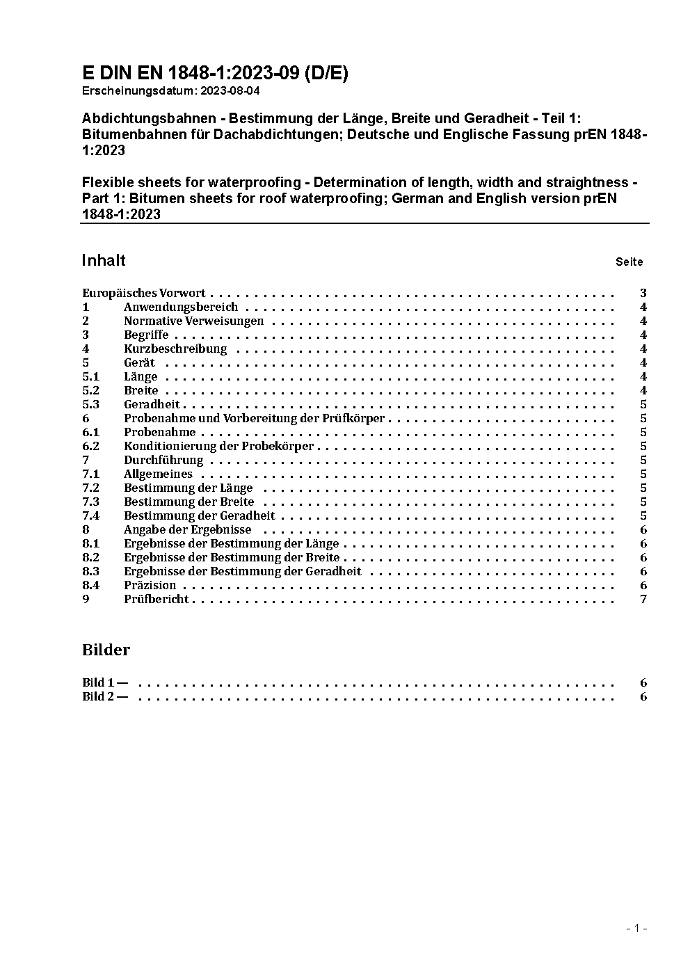 Flexible sheets for waterproofing - Determination of length, width and straightness - Part 1: Bitumen sheets for roof waterproofing; German and English version prEN 1848-1:2023