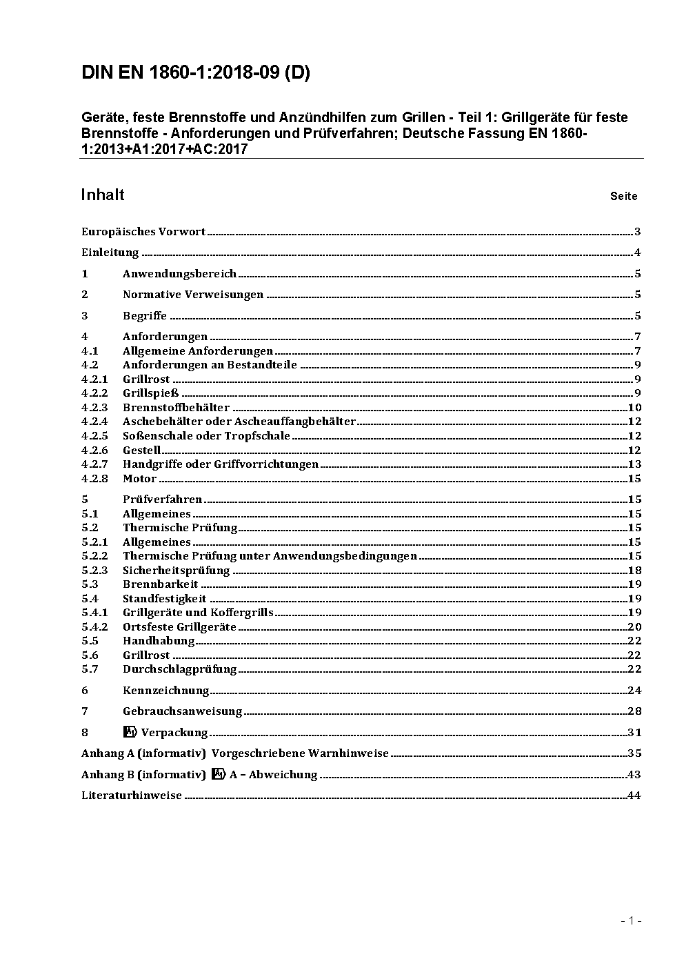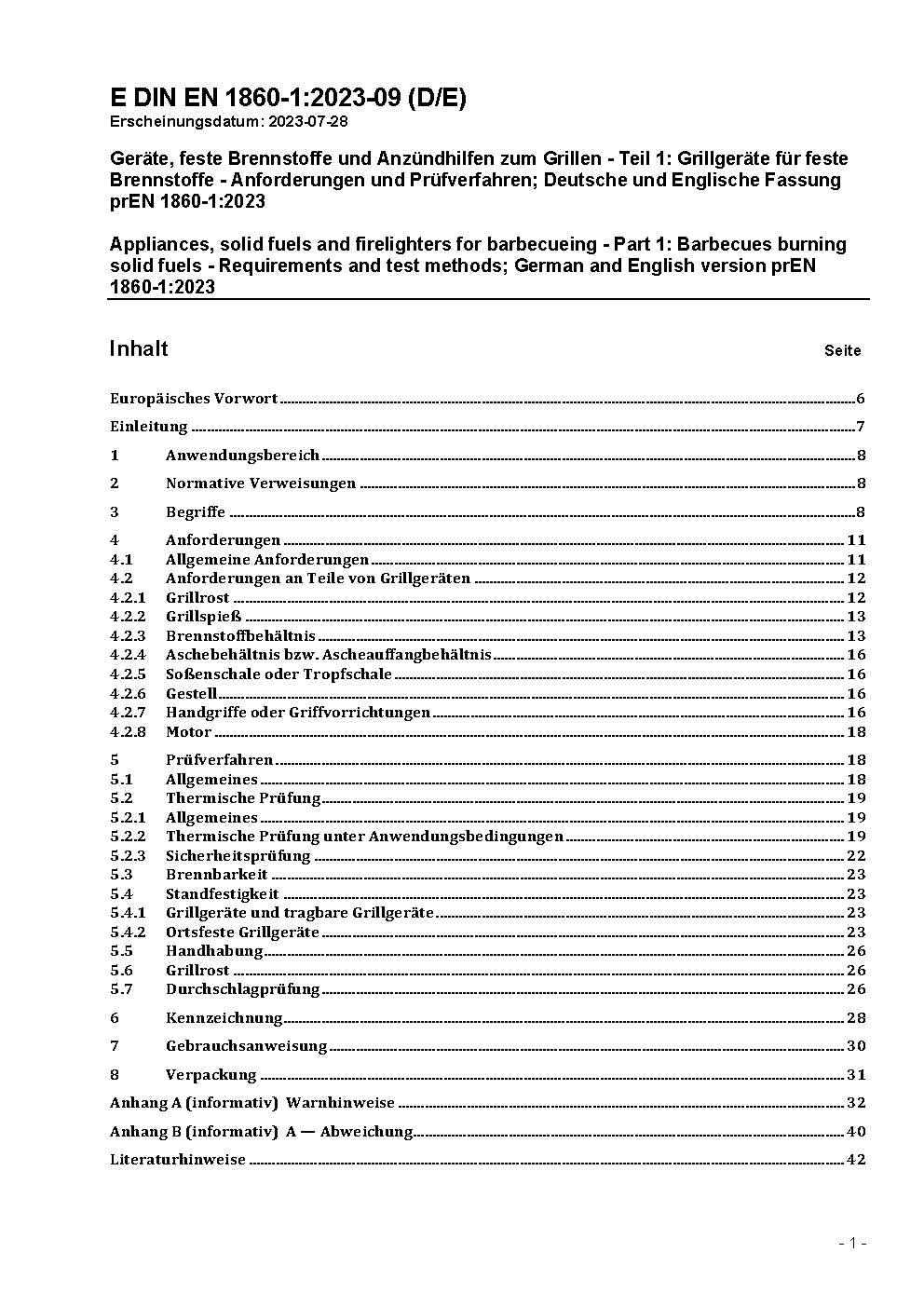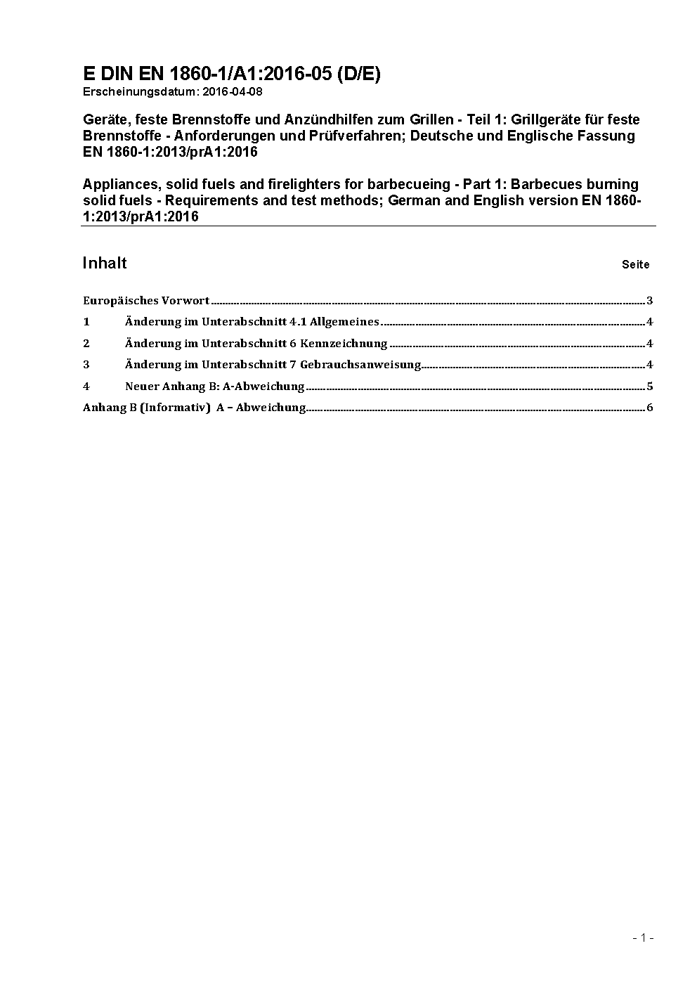 Geräte, feste Brennstoffe und Anzündhilfen zum Grillen - Teil 1: Grillgeräte für feste Brennstoffe - Anforderungen und Prüfverfahren; Deutsche Fassung EN 1860-1:2003/A1:2006 / Achtung: Übergangsfrist, festgelegt durch DIN EN 1860-1 (2013-04), bis 2014-01-30 beachten.