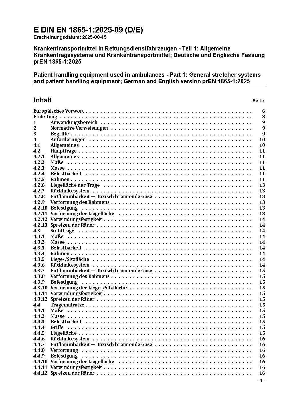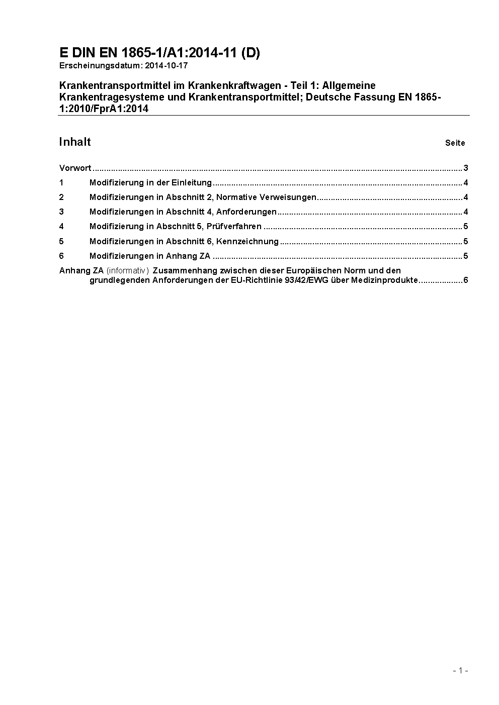 Krankentransportmittel im Krankenkraftwagen - Teil 1: Allgemeine Krankentragesysteme und Krankentransportmittel; Deutsche Fassung EN 1865-1:2010/FprA1:2014