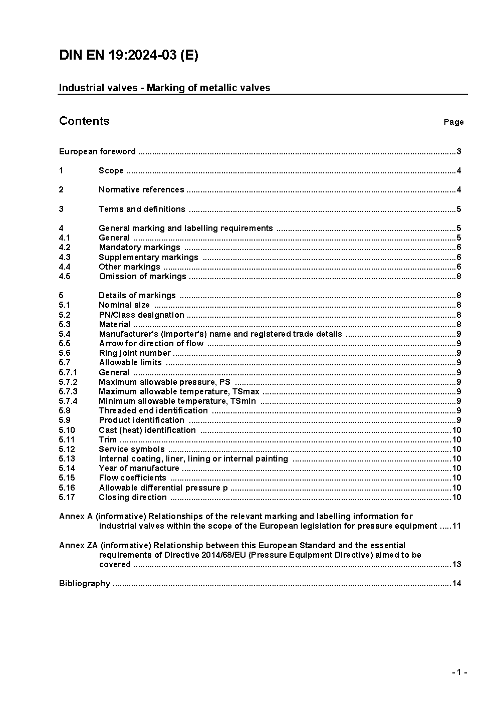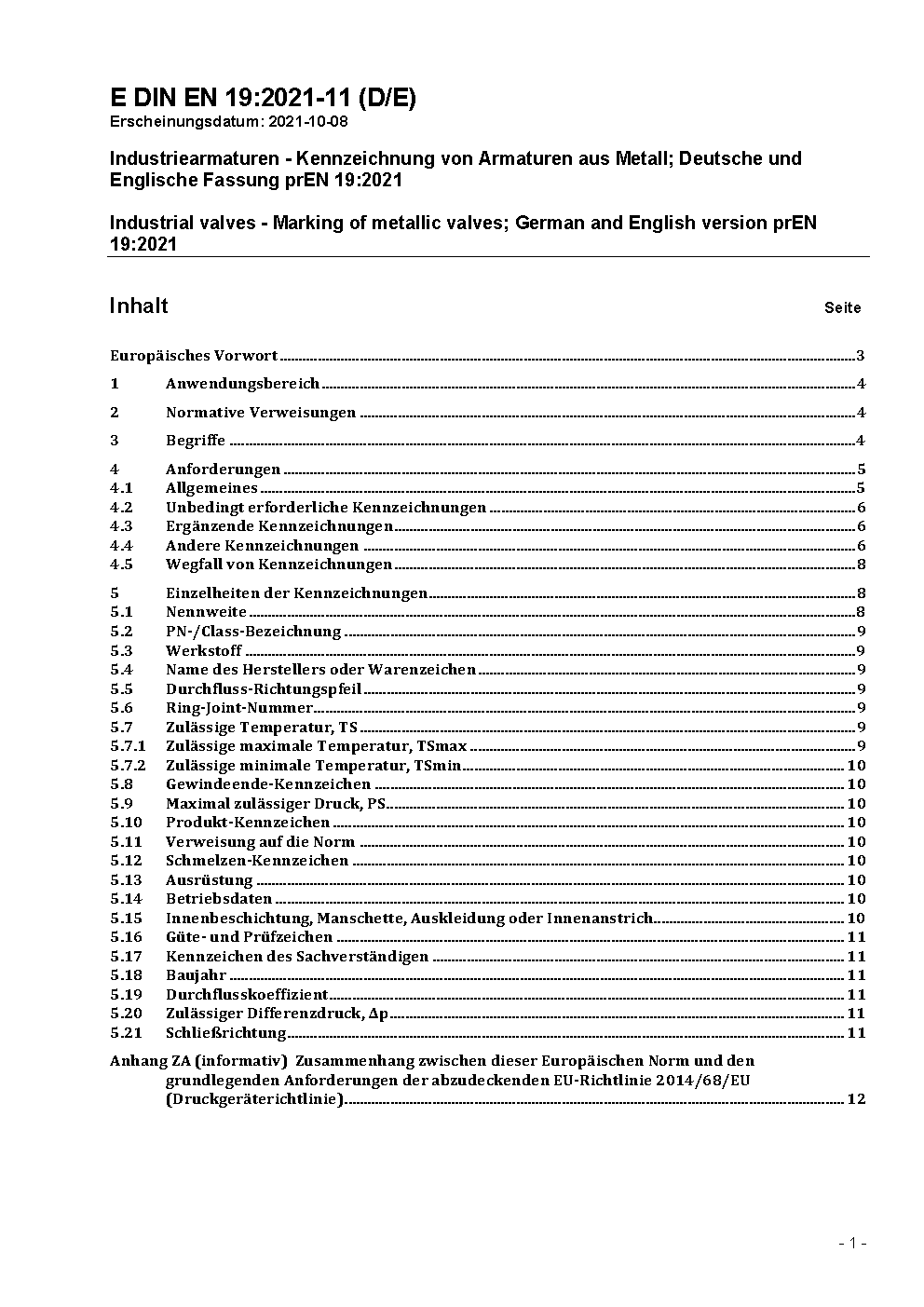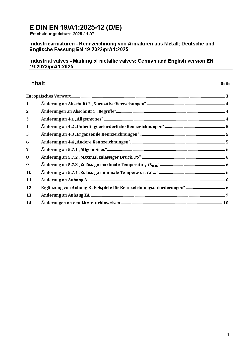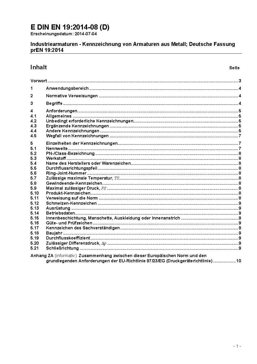 Industriearmaturen - Kennzeichnung von Armaturen aus Metall; Deutsche Fassung prEN 19:2014
