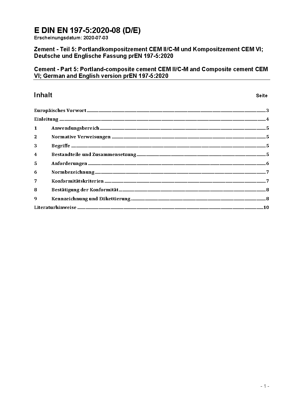 Zement - Teil 5: Portlandkompositzement CEM II/C-M und Kompositzement CEM VI; Deutsche und Englische Fassung prEN 197-5:2020