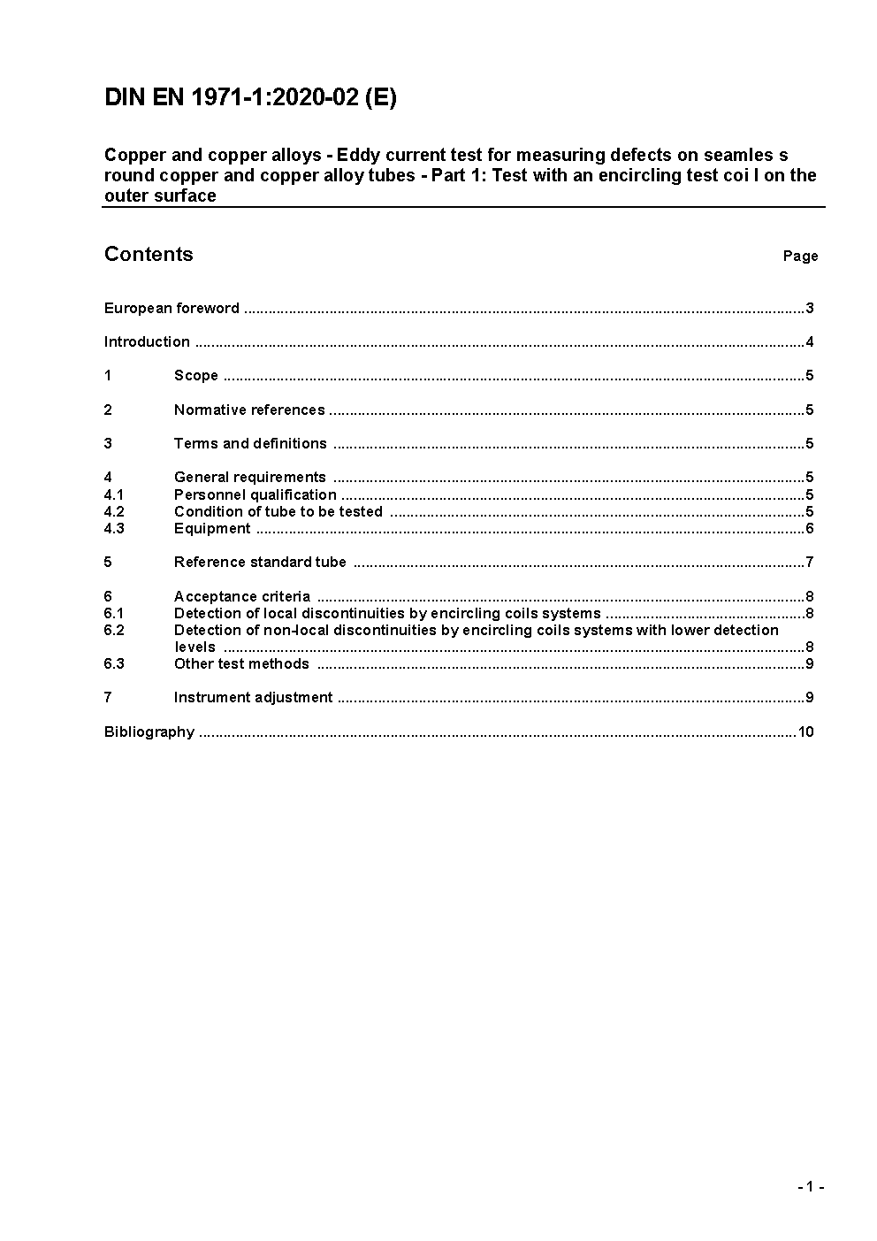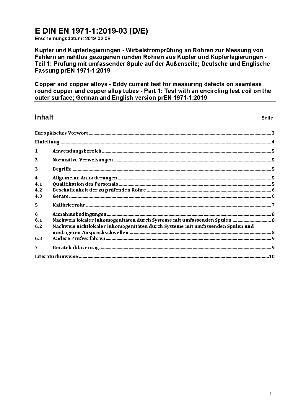 Kupfer und Kupferlegierungen - Wirbelstromprüfung an Rohren zur Messung von Fehlern an nahtlos gezogenen runden Rohren aus Kupfer und Kupferlegierungen - Teil 1: Prüfung mit umfassender Spule auf der Außenseite; Deutsche Fassung EN 1971-1:2019
