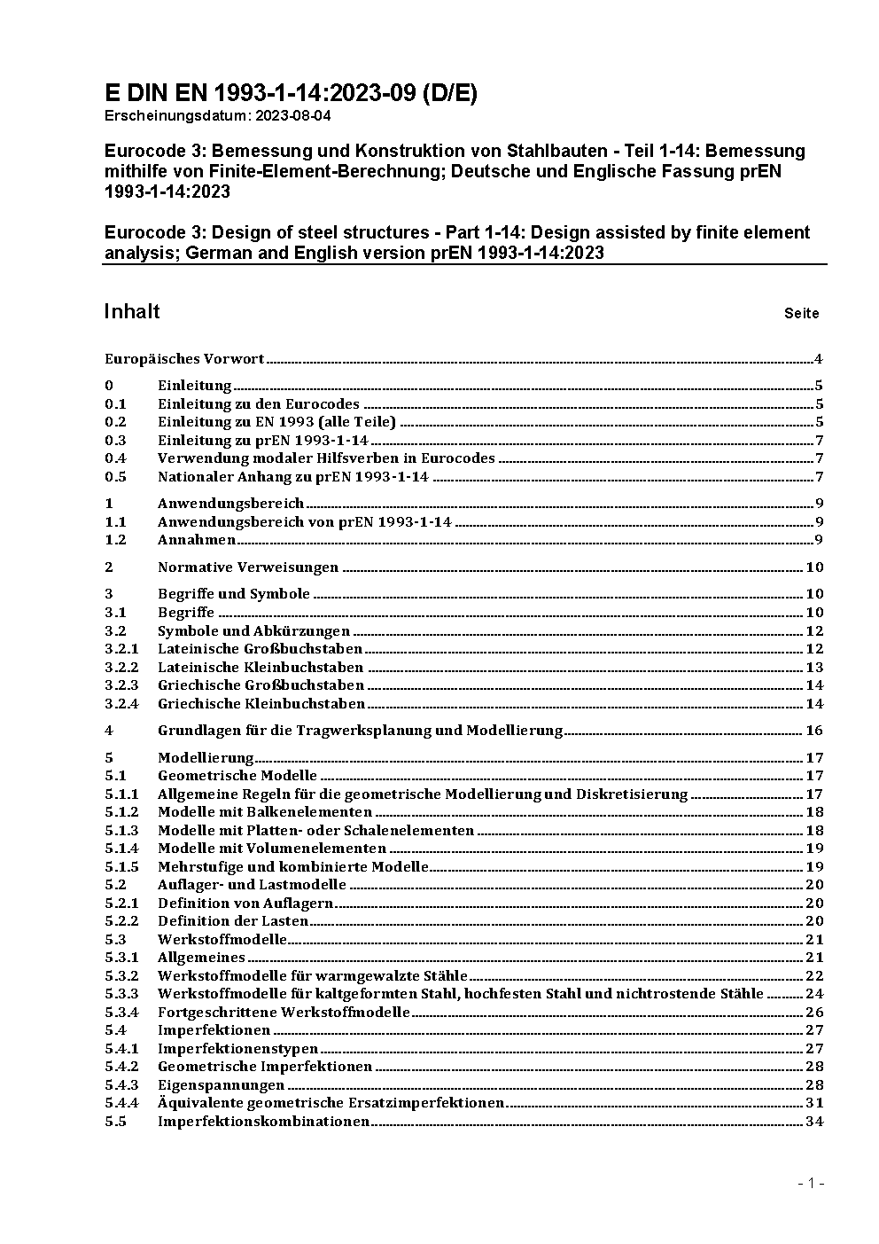Eurocode 3: Bemessung und Konstruktion von Stahlbauten - Teil 1-14: Bemessung mithilfe von Finite-Element-Berechnung; Deutsche und Englische Fassung prEN 1993-1-14:2023