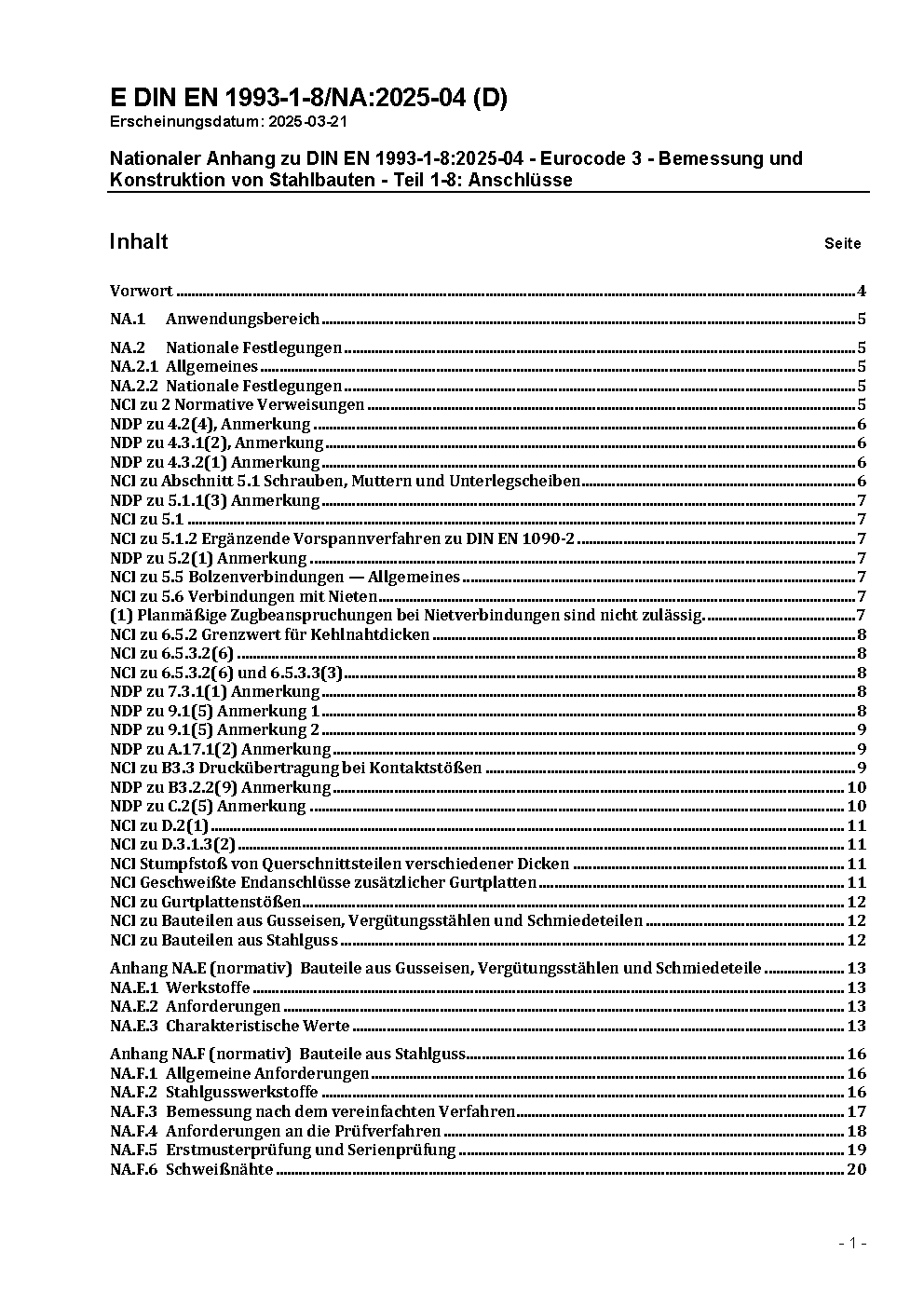 Nationaler Anhang zu DIN EN 1993-1-8:2025-04 - Eurocode 3 - Bemessung und Konstruktion von Stahlbauten - Teil 1-8: Anschlüsse / Achtung: Gilt in Verbindung mit DIN EN 1993-1-8 (2025-04)