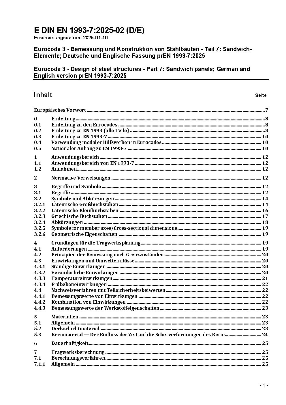 Eurocode 3 - Bemessung und Konstruktion von Stahlbauten - Teil 7: Sandwich-Elemente; Deutsche und Englische Fassung prEN 1993-7:2025