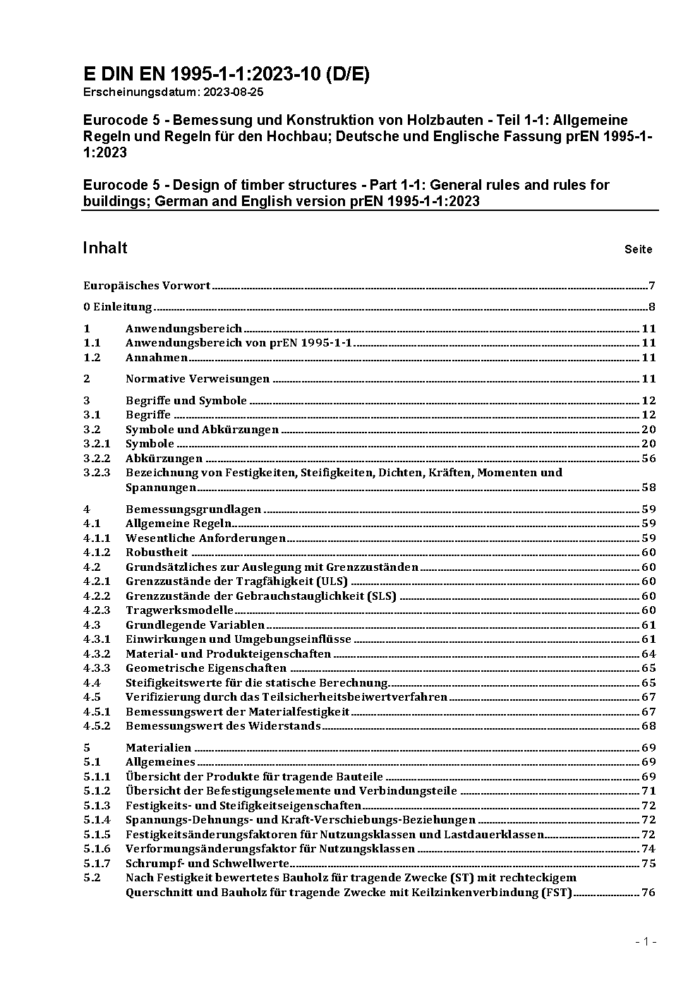 Eurocode 5 - Bemessung und Konstruktion von Holzbauten - Teil 1-1: Allgemeine Regeln und Regeln für den Hochbau; Deutsche und Englische Fassung prEN 1995-1-1:2023