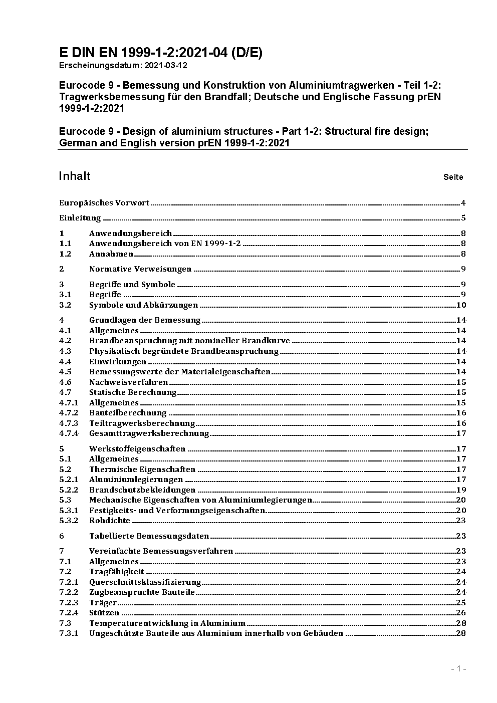 Eurocode 9 - Bemessung und Konstruktion von Aluminiumtragwerken - Teil 1-2: Tragwerksbemessung für den Brandfall; Deutsche und Englische Fassung prEN 1999-1-2:2021