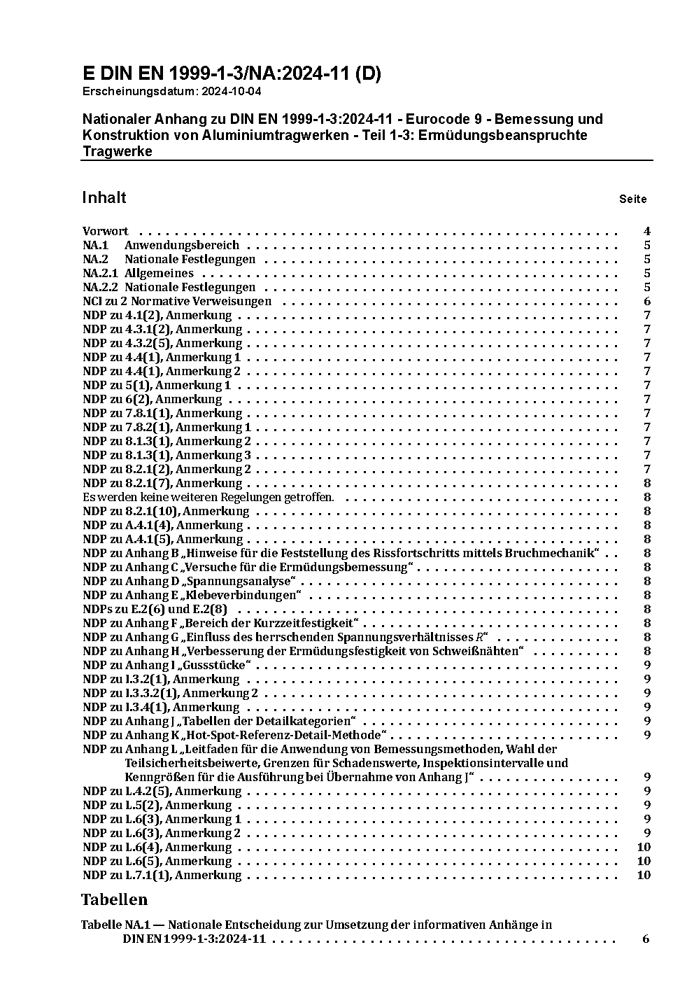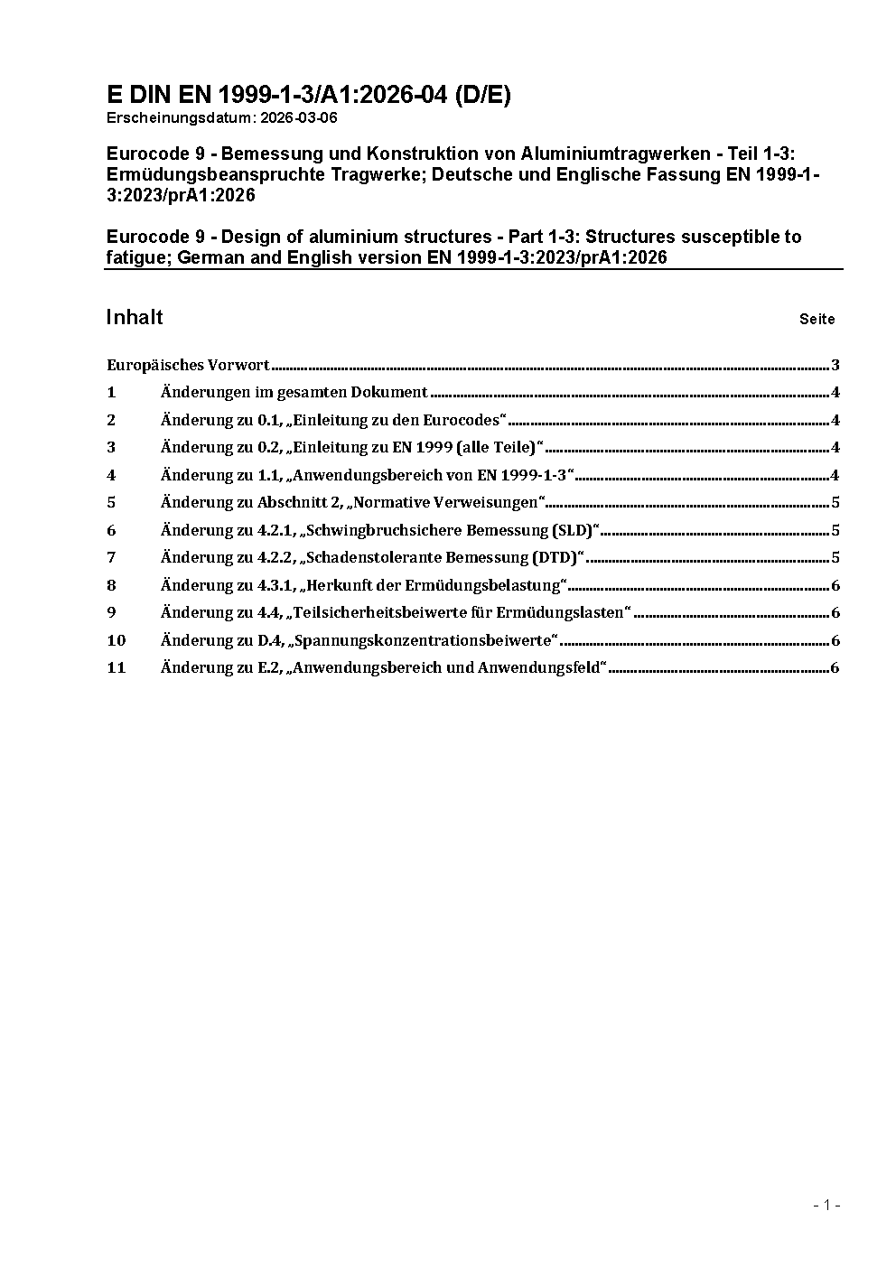 Eurocode 9: Bemessung und Konstruktion von Aluminiumtragwerken - Teil 1-3: Ermüdungsbeanspruchte Tragwerke; Deutsche und Englische Fassung prEN 1999-1-3:2021