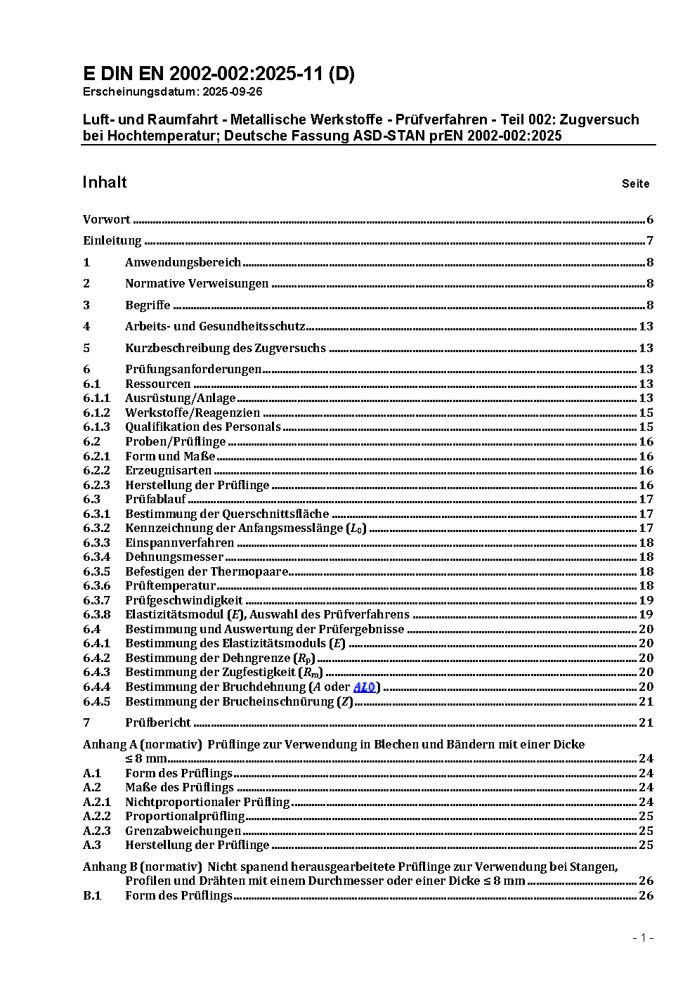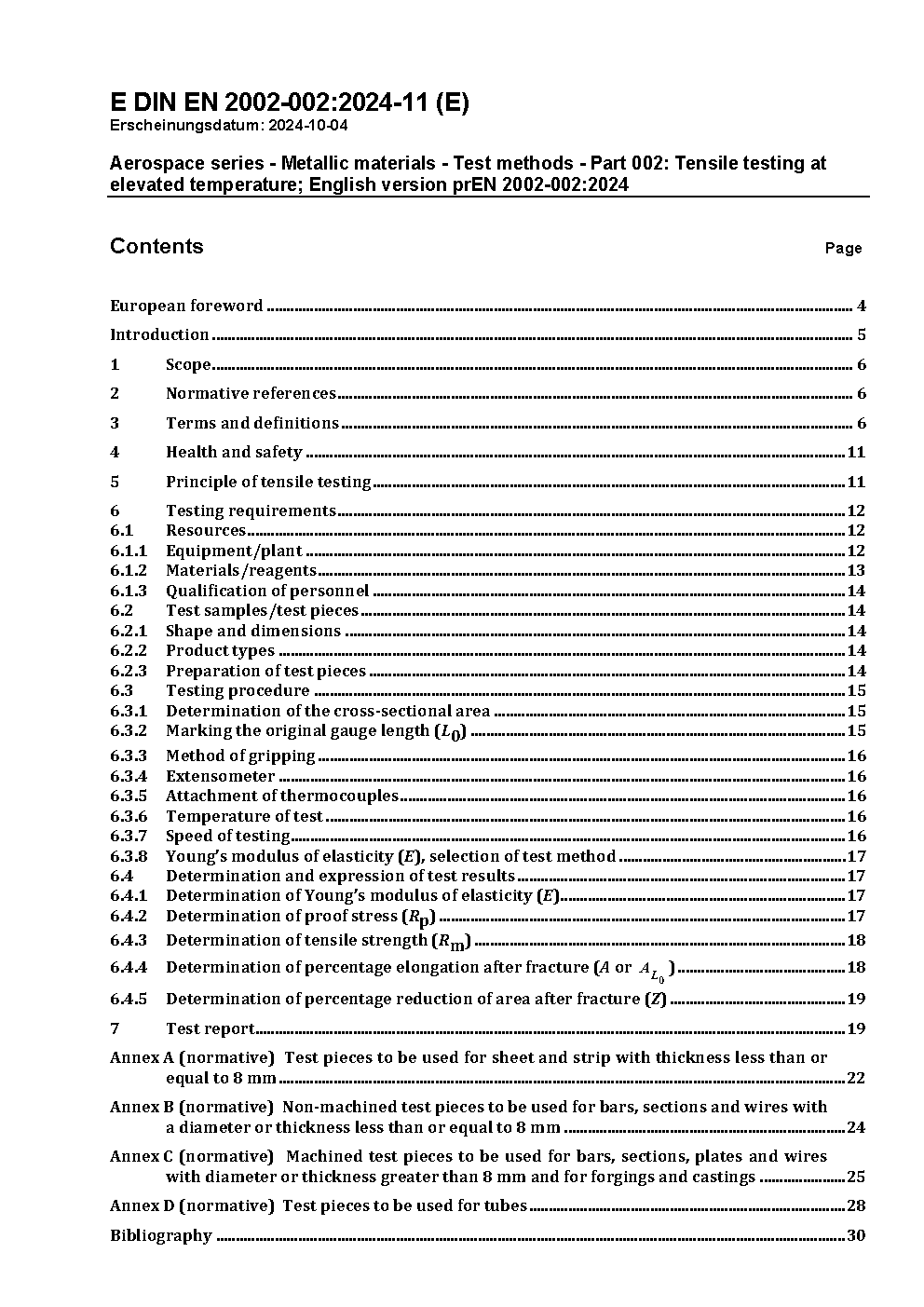 Luft- und Raumfahrt - Metallische Werkstoffe - Prüfverfahren - Teil 2: Zugversuch bei Hochtemperatur; Deutsche und Englische Fassung EN 2002-002:2005