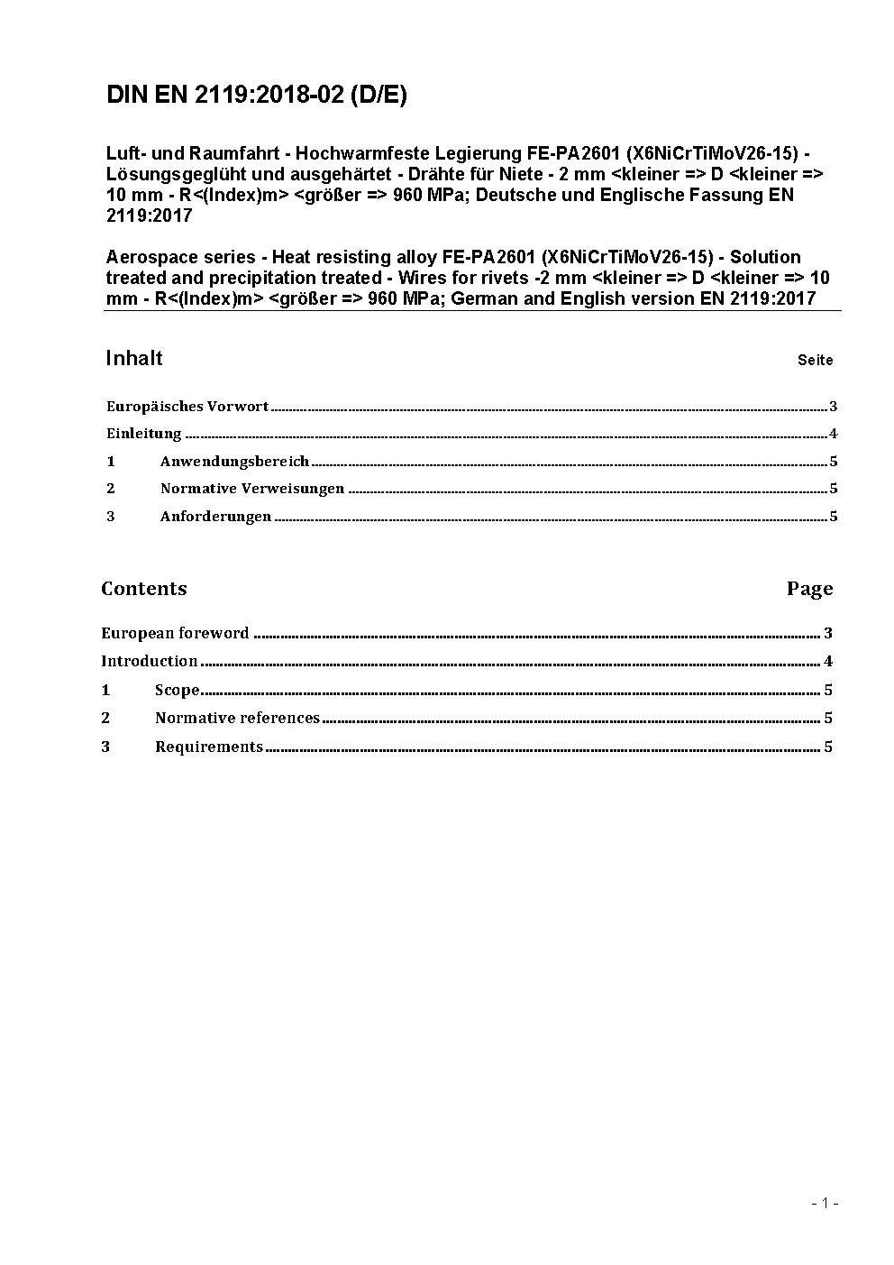 Luft- und Raumfahrt - Hochwarmfeste Legierung FE-PA2601 (X6NiCrTiMoV26-15) - Lösungsgeglüht und ausgehärtet - Drähte für Niete - 2 mm D 10 mm - R<(Index)m> 960 MPa; Deutsche und Englische Fassung EN 2119:2017