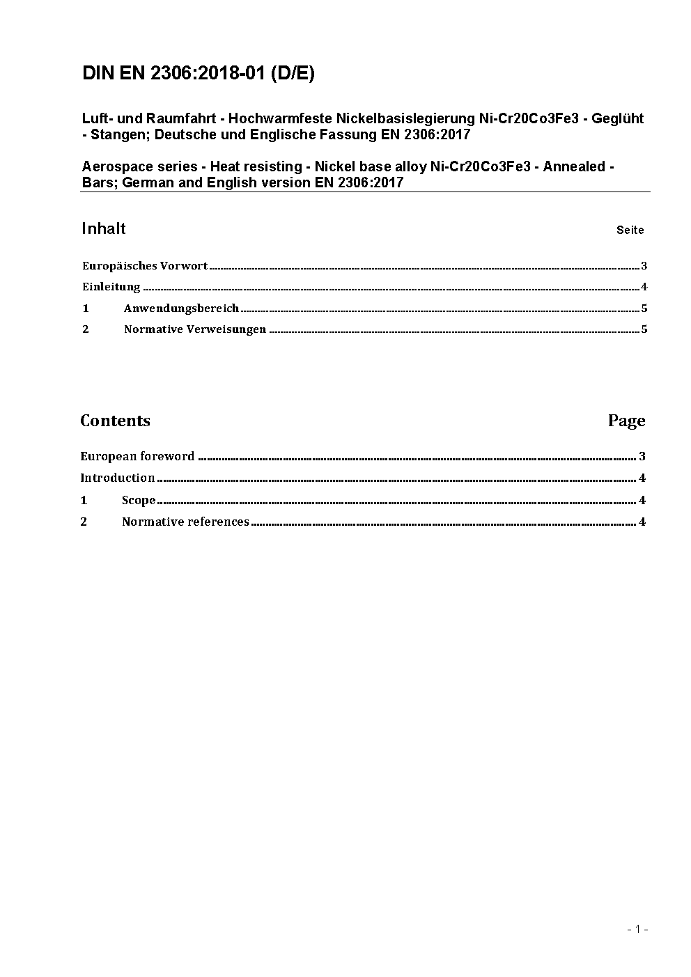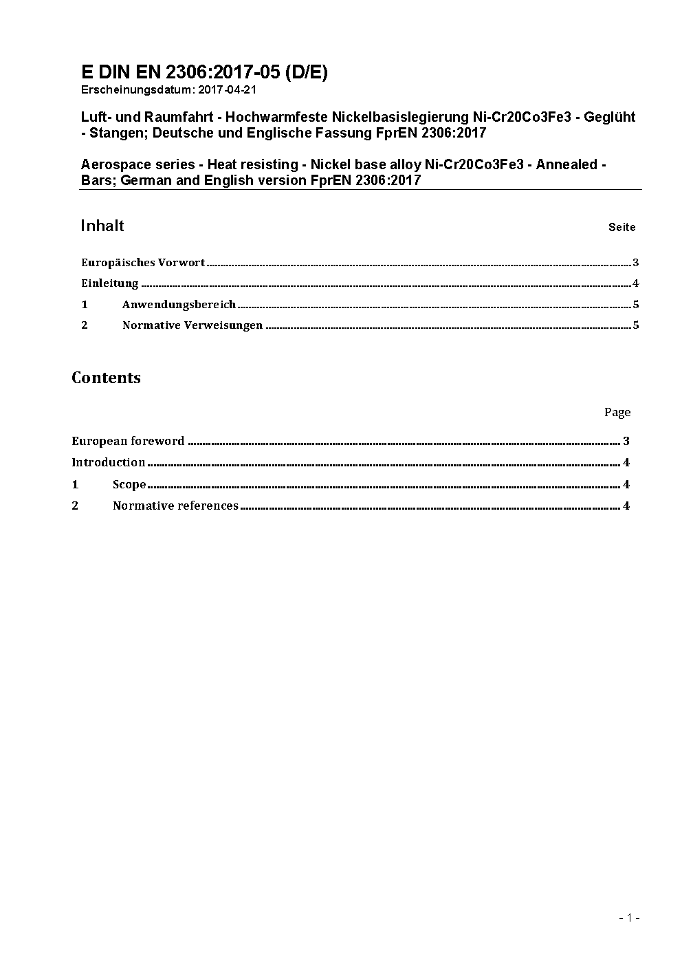 Luft- und Raumfahrt - Hochwarmfeste Nickelbasislegierung Ni-Cr20Co3Fe3 - Geglüht - Stangen; Deutsche und Englische Fassung FprEN 2306:2017