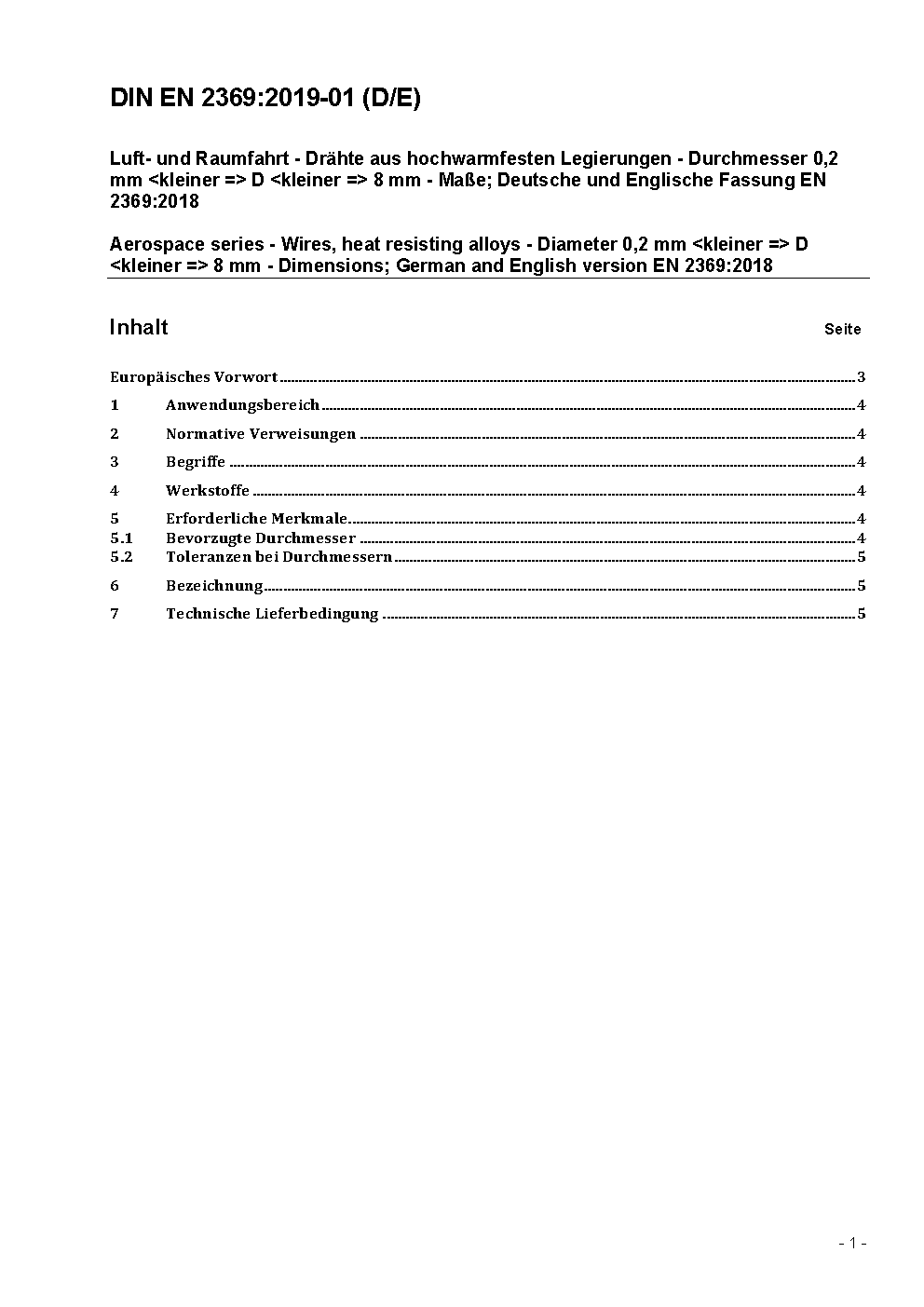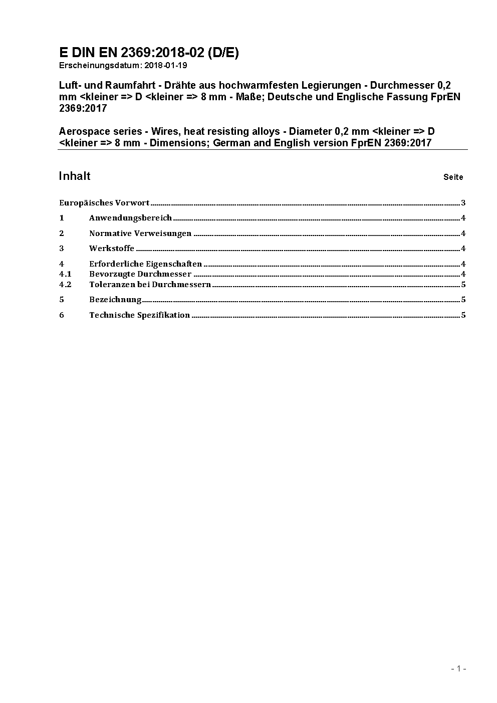 Luft- und Raumfahrt - Drähte aus hochwarmfesten Legierungen - Durchmesser 0,2 mm D 8 mm - Maße; Deutsche und Englische Fassung FprEN 2369:2017