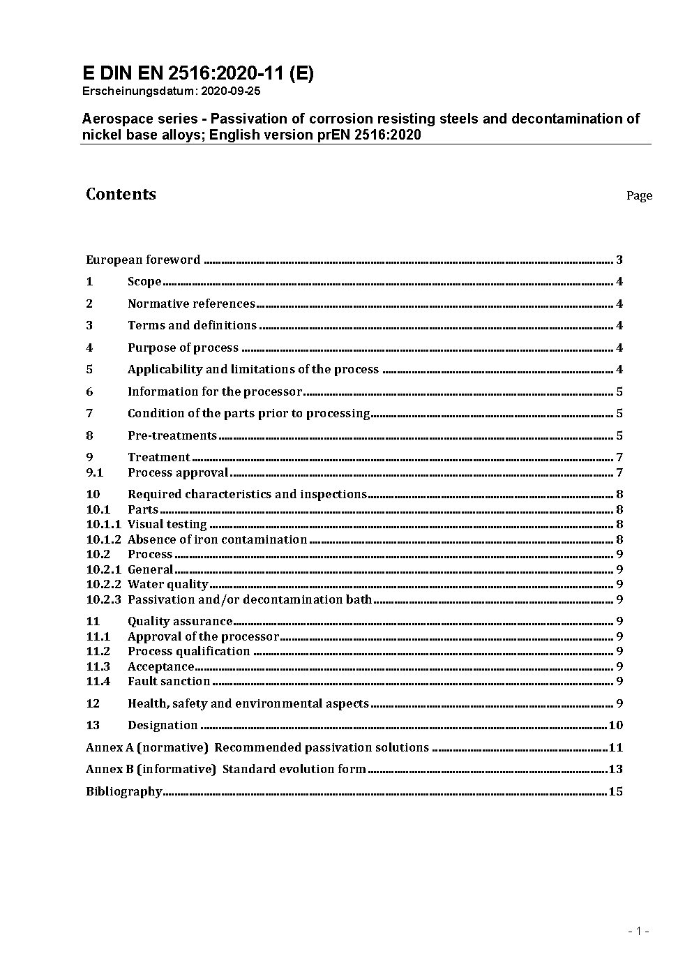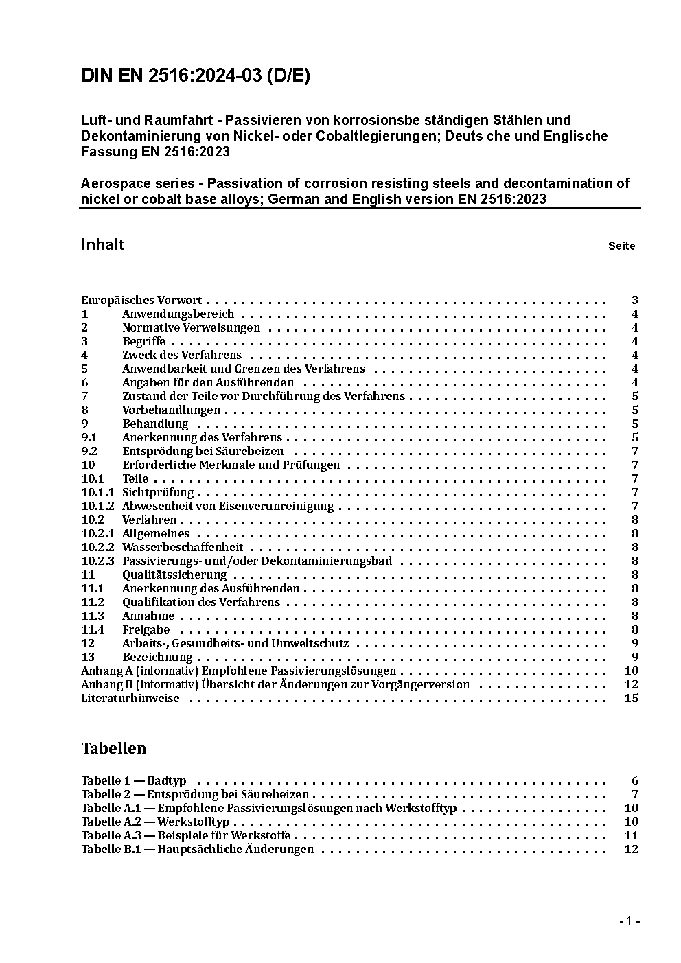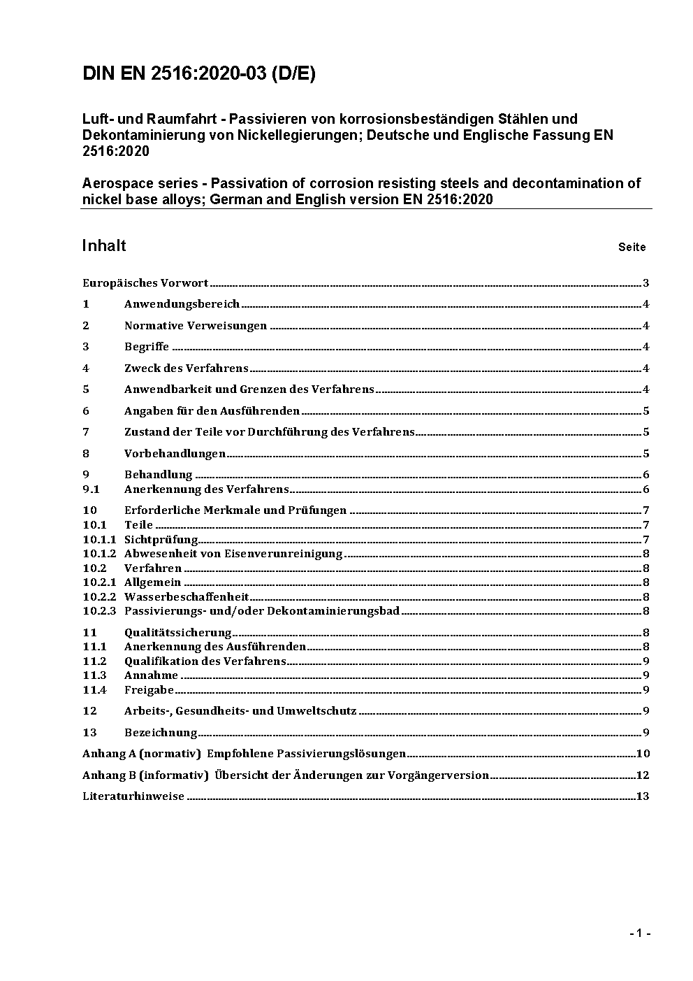 Luft- und Raumfahrt - Passivieren von korrosionsbeständigen Stählen und Dekontaminierung von Nickellegierungen; Deutsche Fassung EN 2516:1997