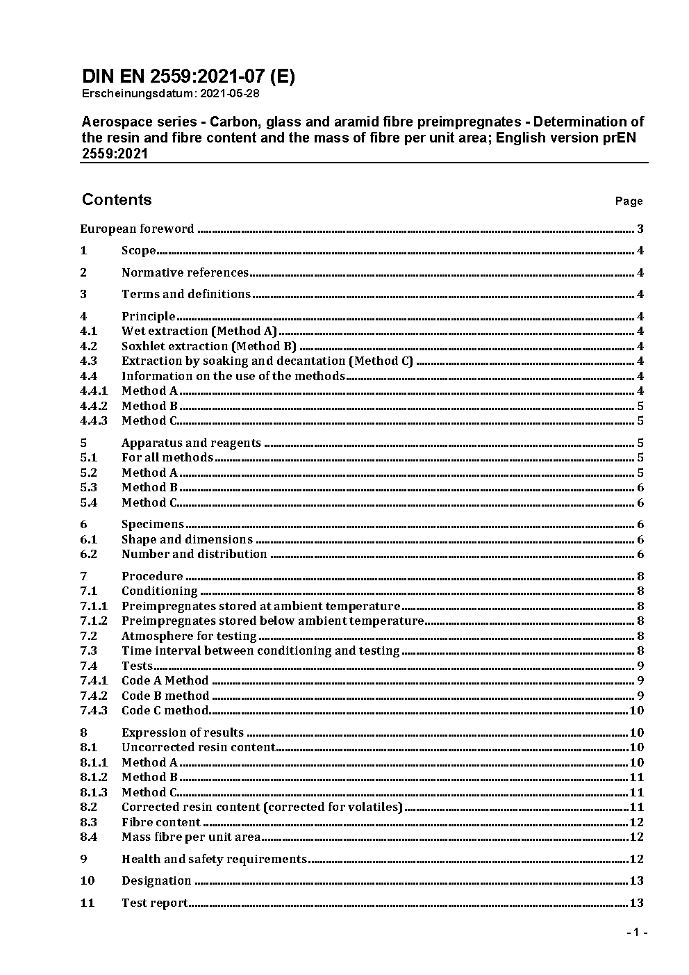 Aerospace series - Carbon, glass and aramid fibre preimpregnates - Determination of the resin and fibre content and the mass of fibre per unit area; German and English version EN 2559:2022