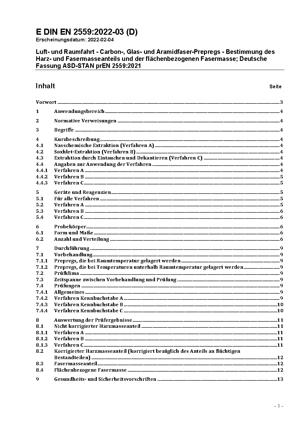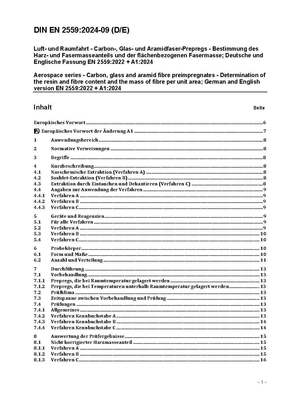 Luft- und Raumfahrt - Carbon-, Glas- und Aramidfaser-Prepregs - Bestimmung des Harz- und Fasermasseanteils und der flächenbezogenen Fasermasse; Deutsche und Englische Fassung EN 2559:2022