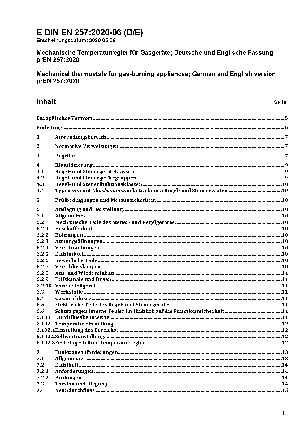 Mechanische Temperaturregler für Gasgeräte; Deutsche Fassung EN 257:2022 / Achtung: Daneben gilt DIN EN 257 (2010-11) noch bis 2025-10-31.*Übergangsfrist, festgelegt durch DIN EN 257 (2024-10), bis 2025-10-31 beachten.*Gilt in Verbindung mit DIN EN 13611 (2022-01)