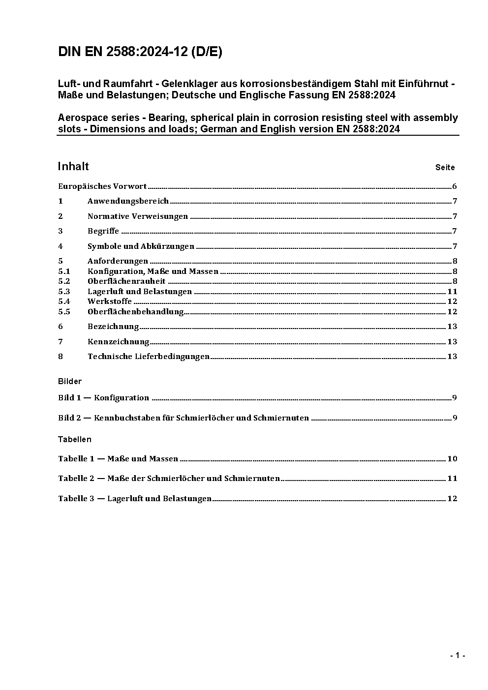 Luft- und Raumfahrt - Gelenklager aus korrosionsbeständigem Stahl mit Einführnut - Maße und Belastungen; Deutsche und Englische Fassung EN 2588:2006