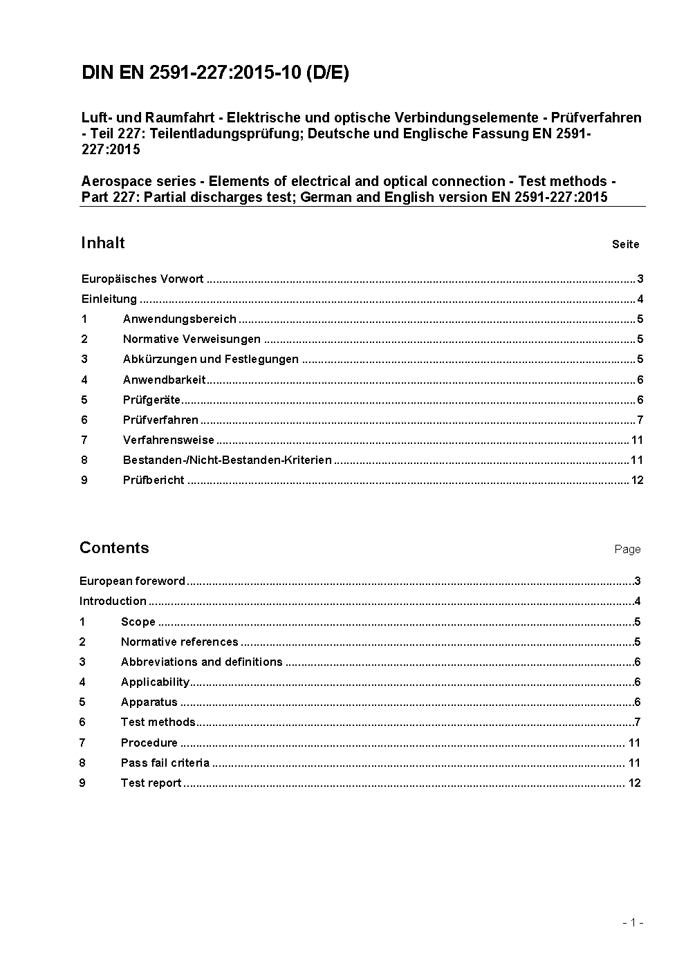 Luft- und Raumfahrt - Elektrische und optische Verbindungselemente - Prüfverfahren - Teil 227: Teilentladungsprüfung; Deutsche und Englische Fassung FprEN 2591-227:2014