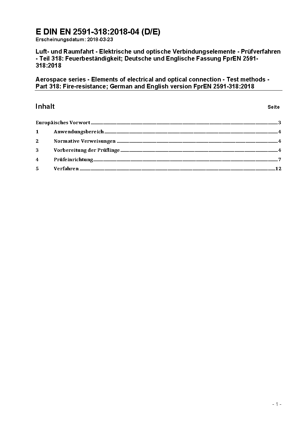 Aerospace series - Elements of electrical and optical connection; test methods - Part 318: Fire-resistance; German version EN 2591-318:1998.