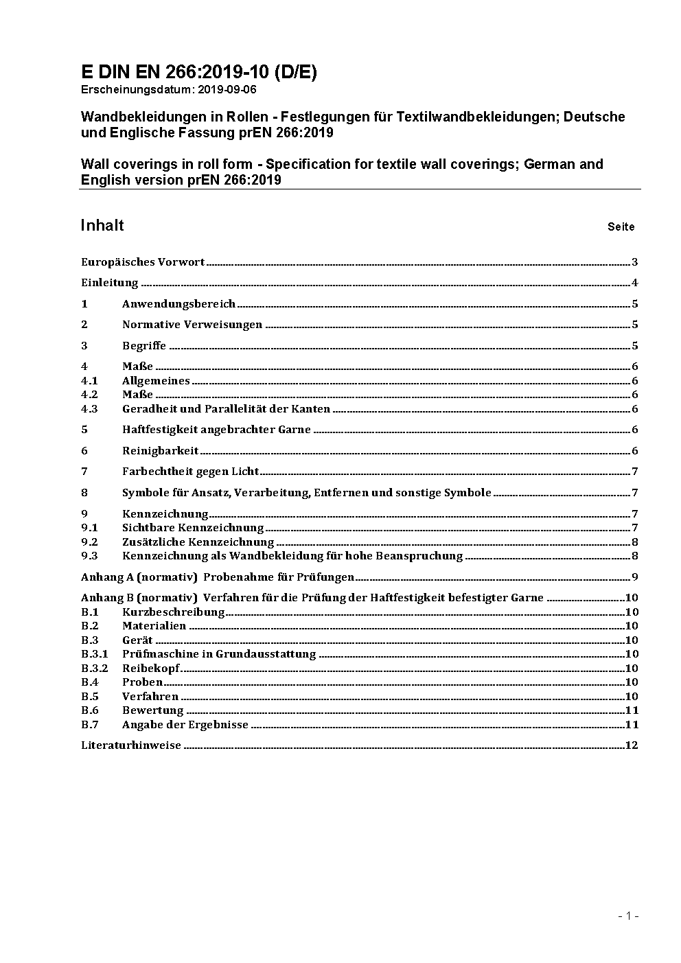 Wandbekleidungen in Rollen; Festlegungen für Textilwandbekleidungen; Deutsche Fassung EN 266:1991