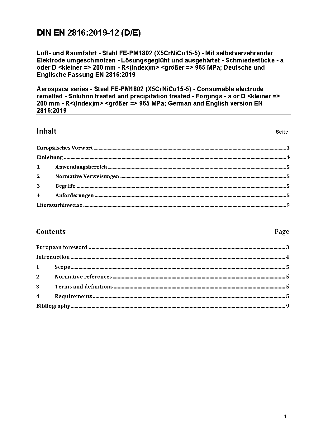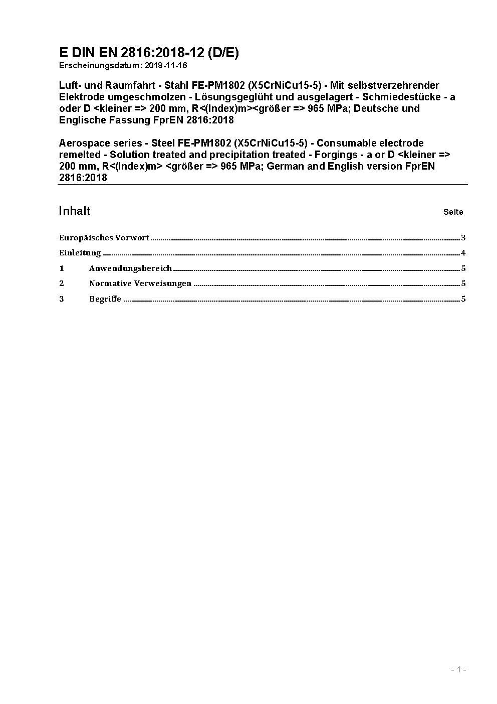 Luft- und Raumfahrt - Stahl FE-PM1802 (X5CrNiCu15-5) mit selbstverzehrender Elektrode umgeschmolzen, lösungsgeglüht und ausgehärtet - Schmiedestücke a oder D 200 mm, R<(Index)m> 965 MPa