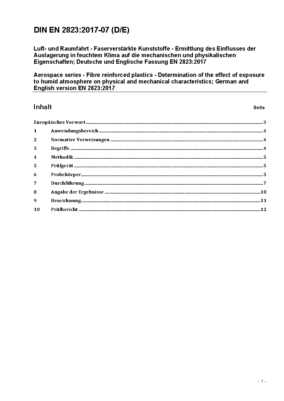 Luft- und Raumfahrt - Faserverstärkte Kunststoffe - Ermittlung des Einflusses der Auslagerung in feuchtem Klima auf die mechanischen und physikalischen Eigenschaften; Deutsche und Englische Fassung FprEN 2823:2016