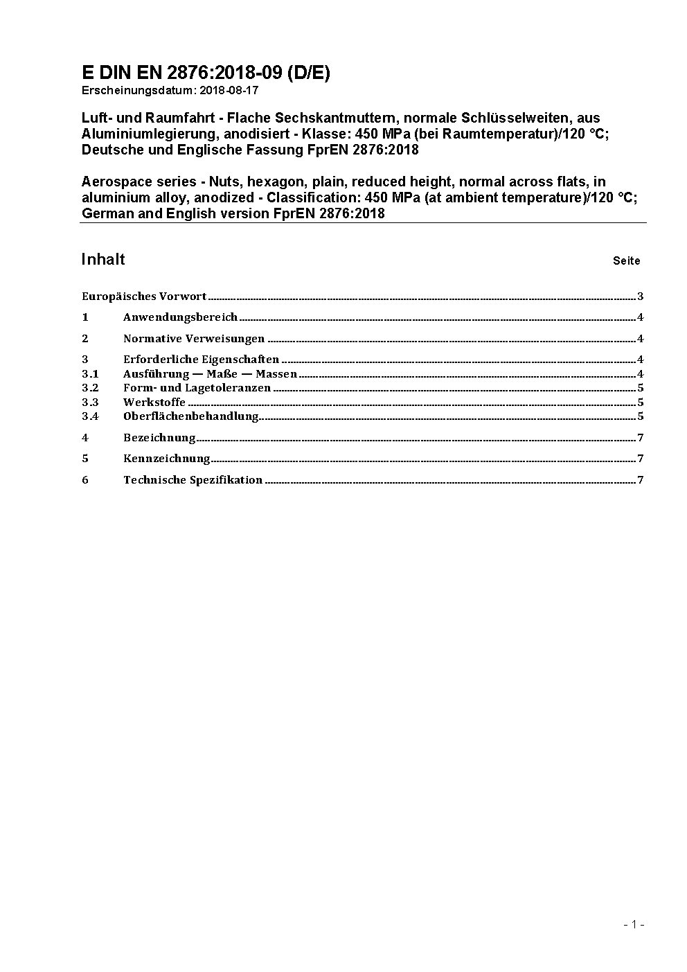 Luft- und Raumfahrt - Flache Sechskantmuttern - Normale Schlüsselweiten, aus Aluminiumlegierung, anodisiert; Klasse 450 MPa (bei Raumtemperatur)/120 °C