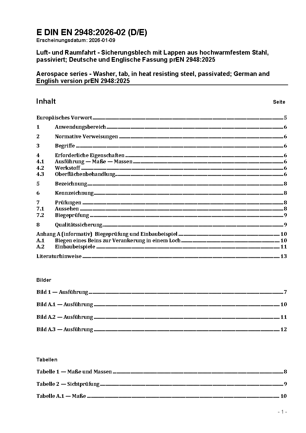 Luft- und Raumfahrt - Sicherungsblech mit Lappen aus hochwarmfestem Stahl, passiviert; Deutsche und Englische Fassung prEN 2948:2025