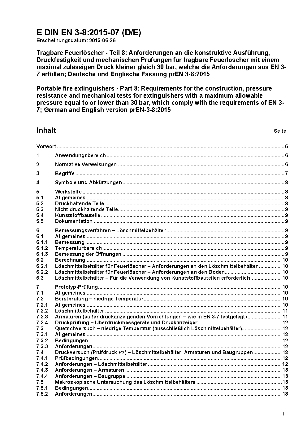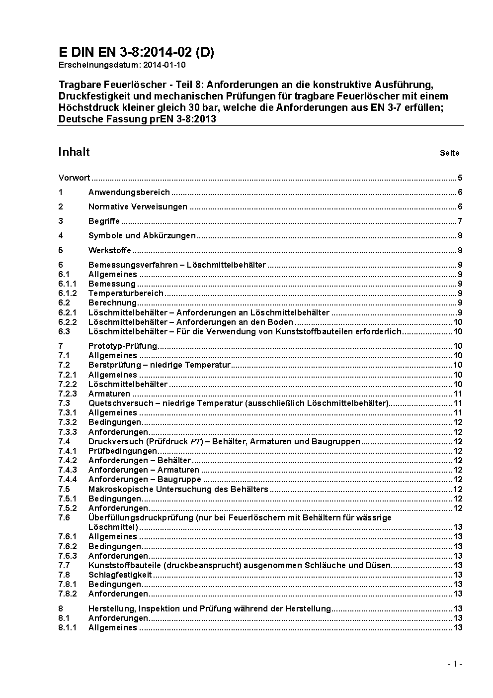 Tragbare Feuerlöscher - Teil 8: Anforderungen an die konstruktive Ausführung, Druckfestigkeit und mechanischen Prüfungen für tragbare Feuerlöscher mit einem Höchstdruck kleiner gleich 30 bar, welche die Anforderungen aus EN 3-7 erfüllen; Deutsche Fassung prEN 3-8:2013