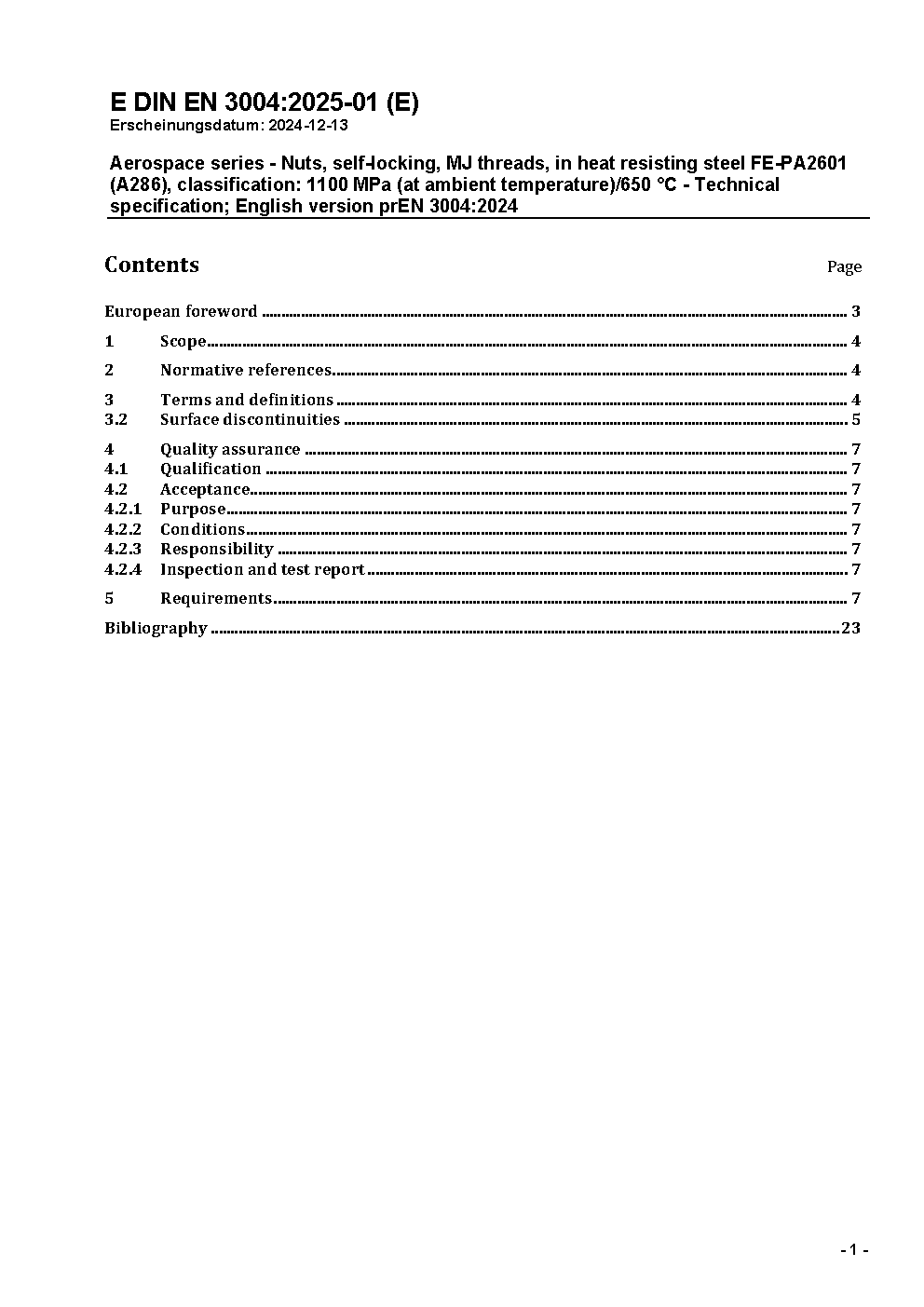 Luft- und Raumfahrt - Muttern, selbstsichernd, MJ-Gewinde, aus hochwarmfestem Stahl FE-PA2601 (A286); Klasse: 1100 MPa (bei Raumtemperatur)/650 °C; Technische Lieferbedingungen; Deutsche Fassung EN 3004:1997