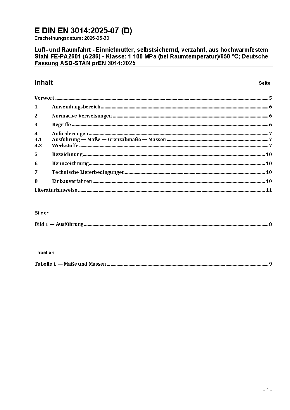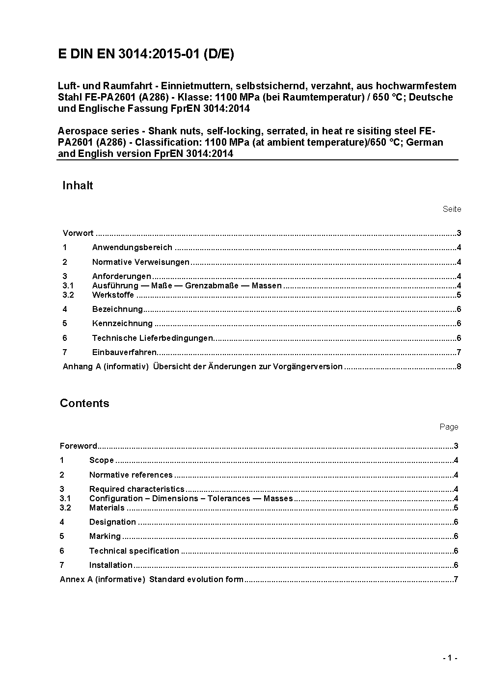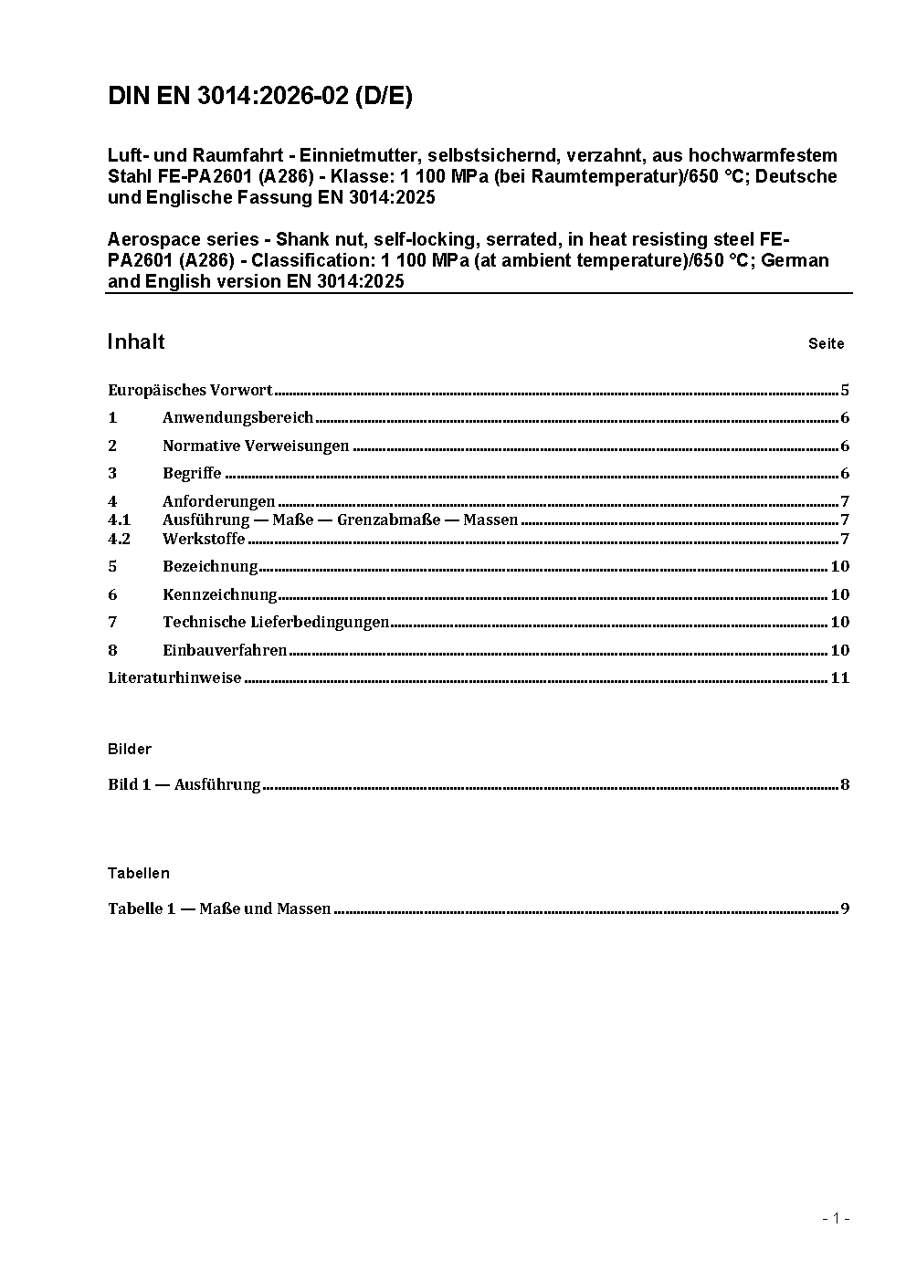 Luft- und Raumfahrt - Einnietmuttern, selbstsichernd, verzahnt, aus hochwarmfestem Stahl FE-PA2601 (A286) - Klasse: 1100 MPa (bei Raumtemperatur)/650 °C; Deutsche Fassung EN 3014:2001