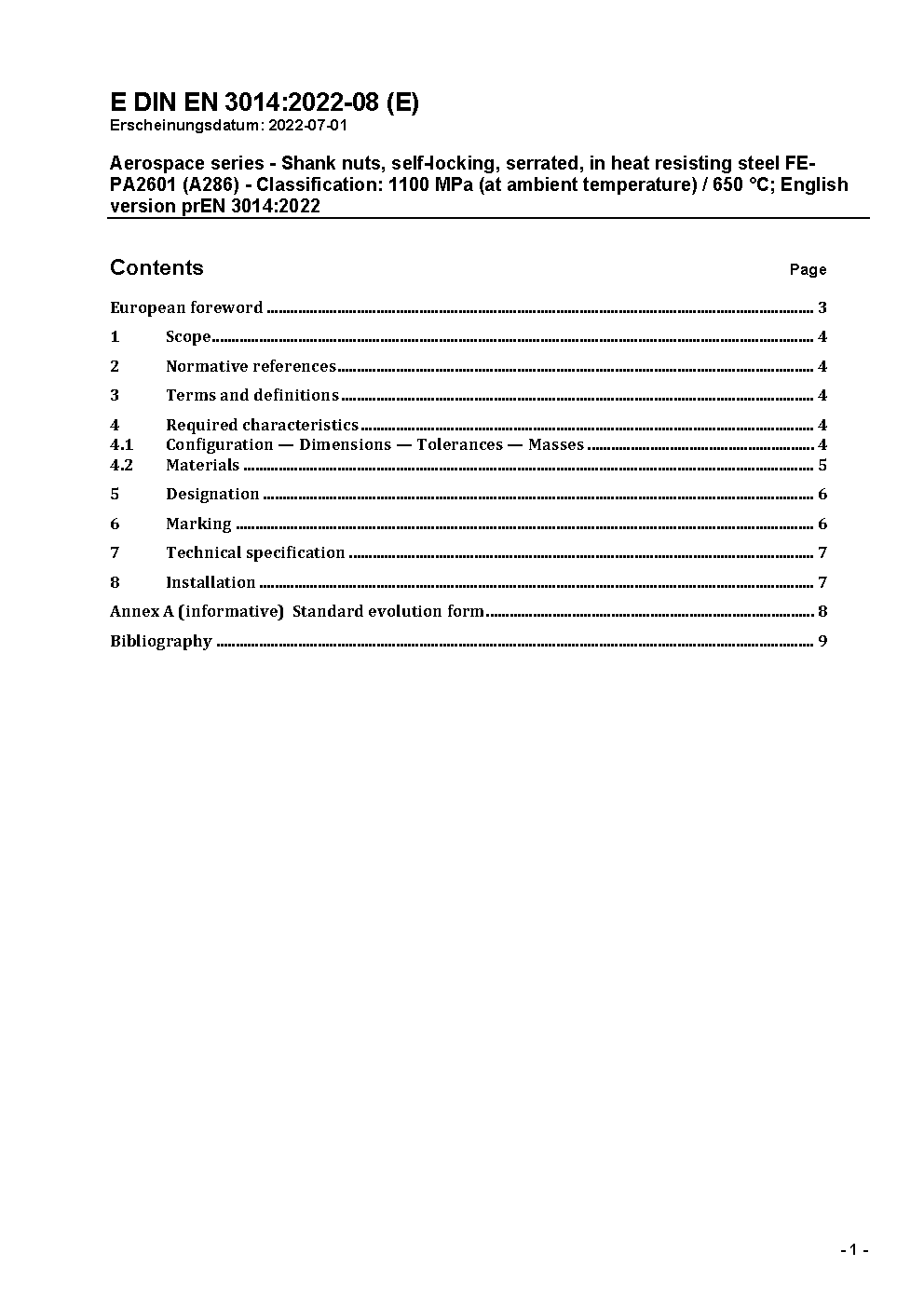 Aerospace series - Shank nuts, self-locking, serrated, in heat resisting steel FE-PA2601 (A286) - Classification 1100 MPa (at ambient temperature)/650 °C; German version EN 3014:2001
