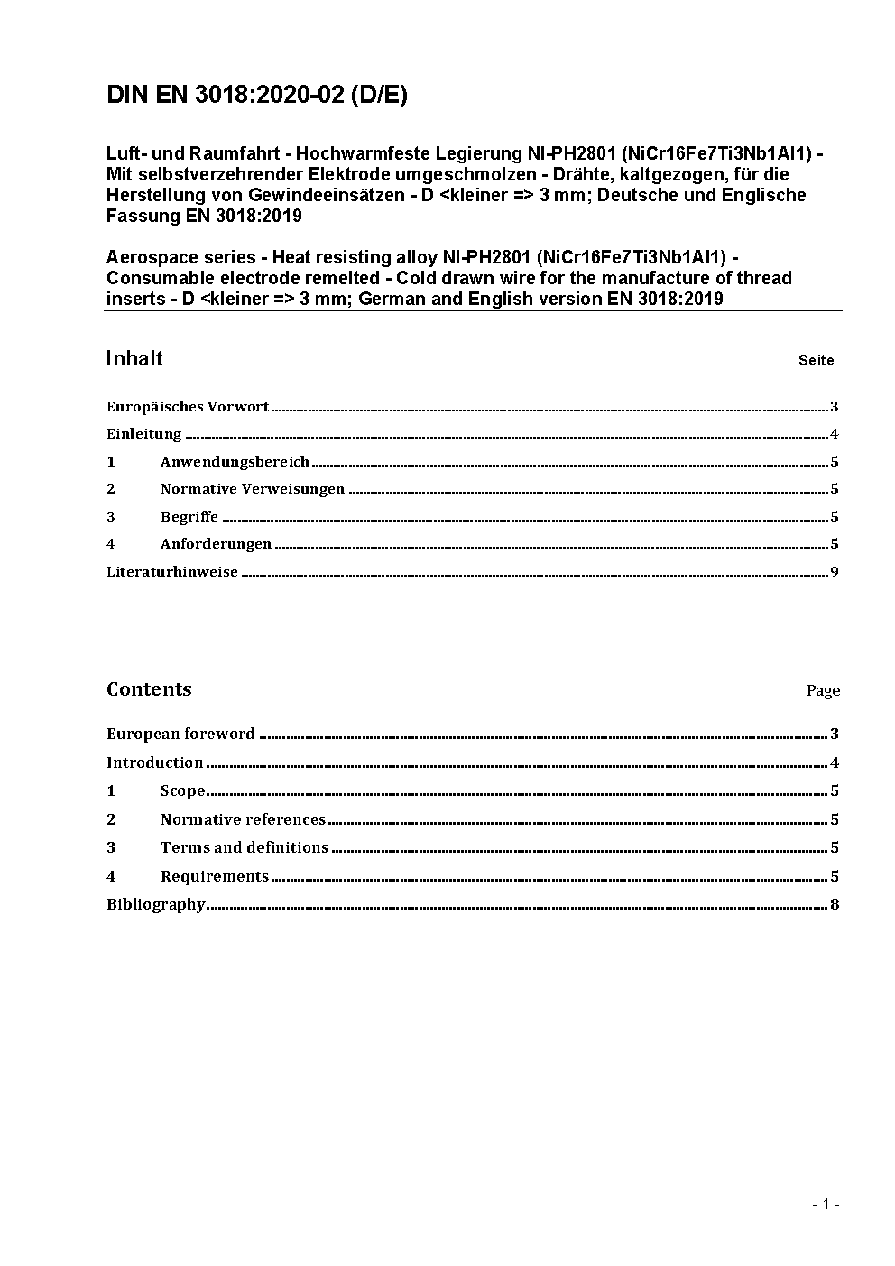 Luft- und Raumfahrt - Hochwarmfeste Legierung NI-PH2801 (NiCr16Fe7Ti3Nb1Al1) mit selbstverzehrender Elektrode umgeschmolzen - Drähte, kaltgezogen, für die Herstellung von Gewindeeinsätzen - D 3 mm; Deutsche und Englische Fassung FprEN 3018:2018