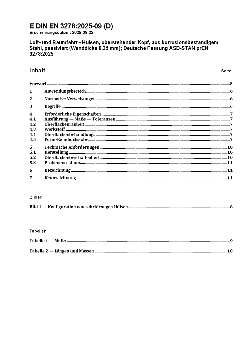 Luft- und Raumfahrt - Hülsen, überstehender Kopf, aus korrosionsbeständigem Stahl, passiviert (Wanddicke 0,25 mm); Deutsche und Englische Fassung EN 3278:2012
